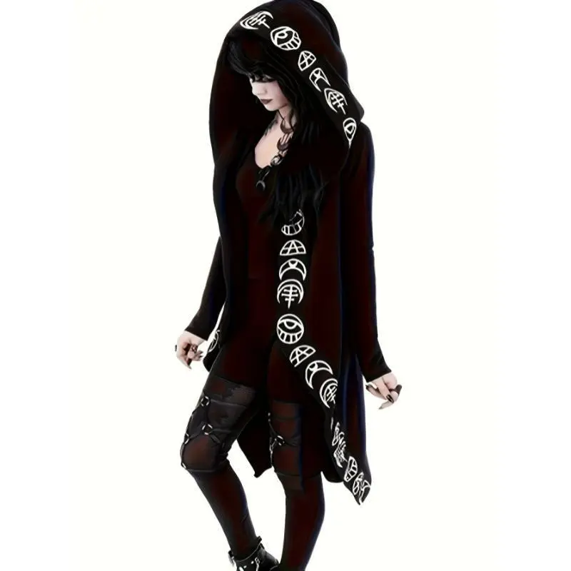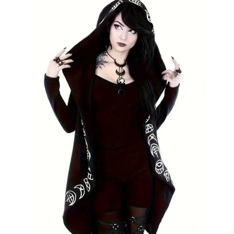 Women's Gothic Moon Geometric Pattern Hooded Zipper Autumn/Winter Jacket Long Sleeve Slightly Elastic Pocket Women's Sportswear