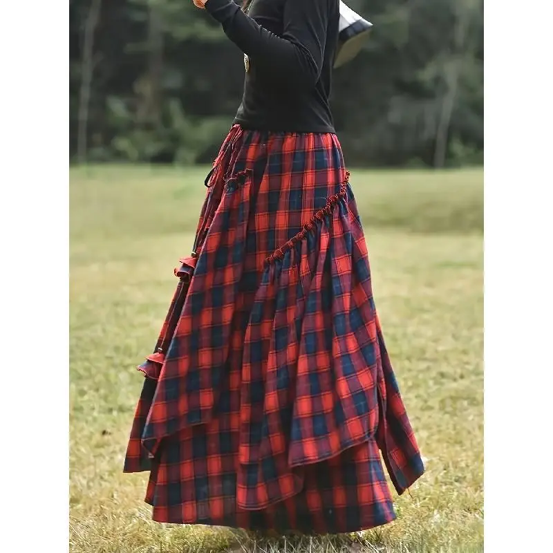 LimitedEditionRetroIrregularLoosePlaidTasselWaistSkirtRuffleMidiSkirtWomenswearBottom