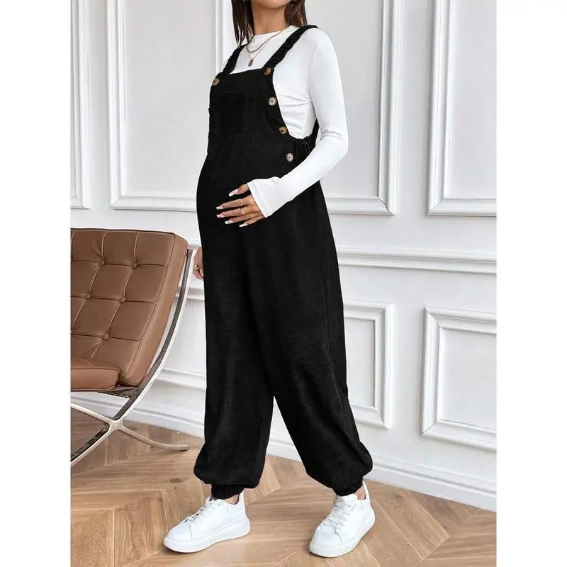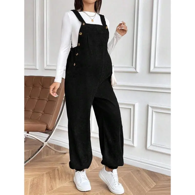 ? Product Overview ? This maternity jumpsuit is designed for daily wear. It features a high waist and is unlined, offering a loose fit. The fabric is made of 97% polyester and 3% elastane, providing medium stretch. The jumpsuit is sleeveless and long, with a plain pattern. It includes buttons and pockets for convenience. The material is not lined for added warmth. Key Features ?? Additional Information ?? The jumpsuit is not sheer. It is suitable for pregnancy wear. The medium stretch fabric ensures comfort. There are no additional lining features. The color is black. This jumpsuit is a casual choice for daily wear.