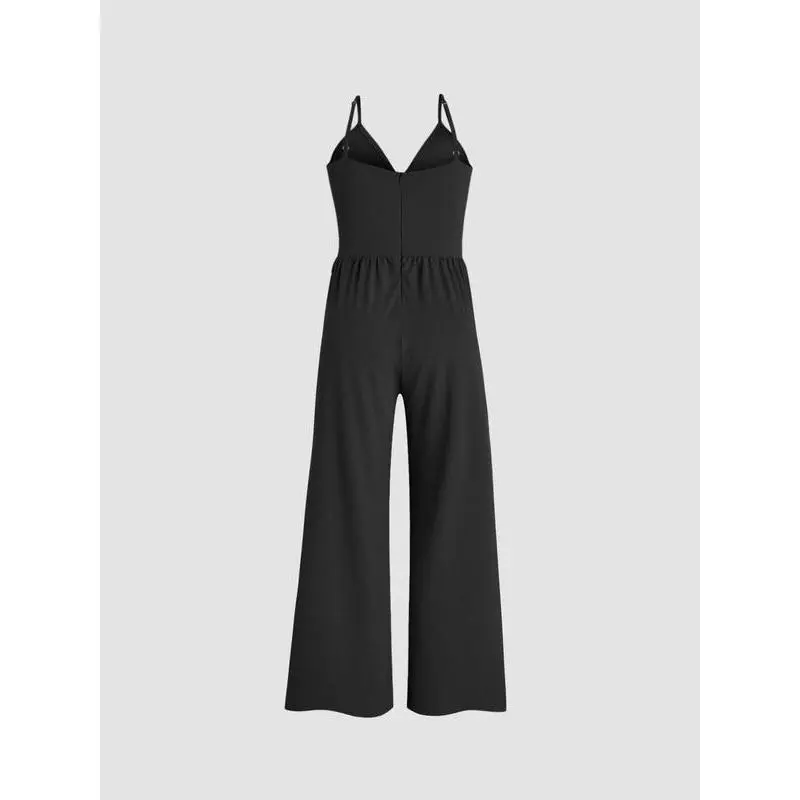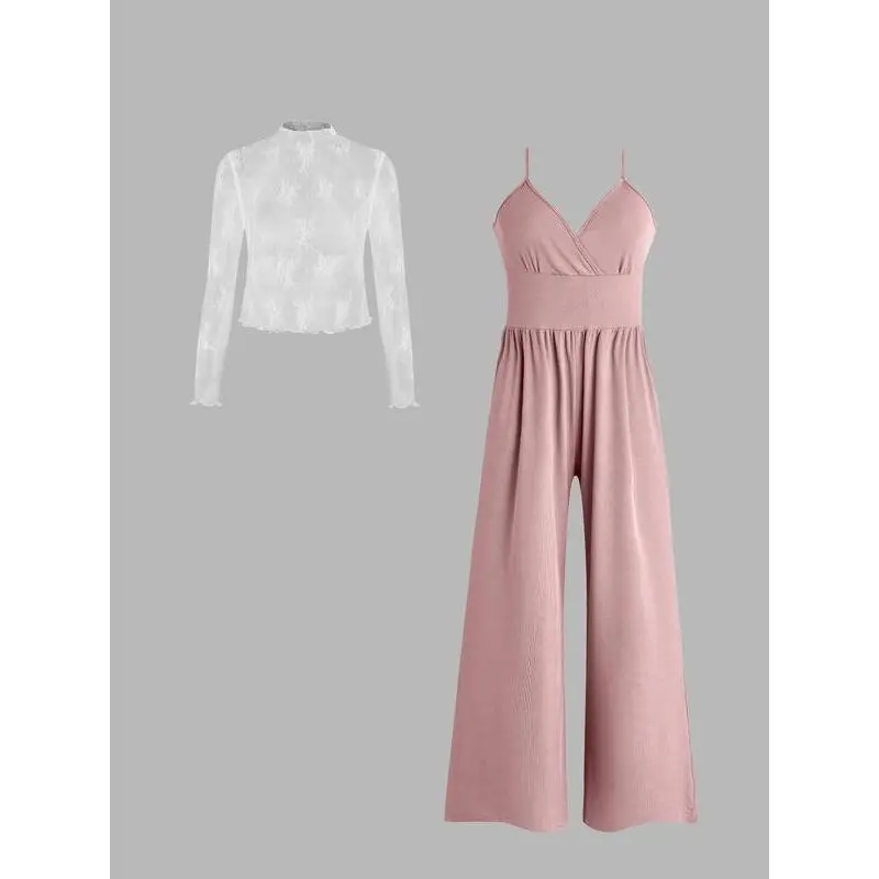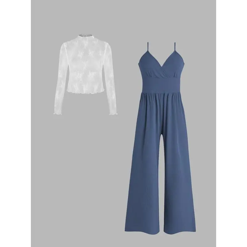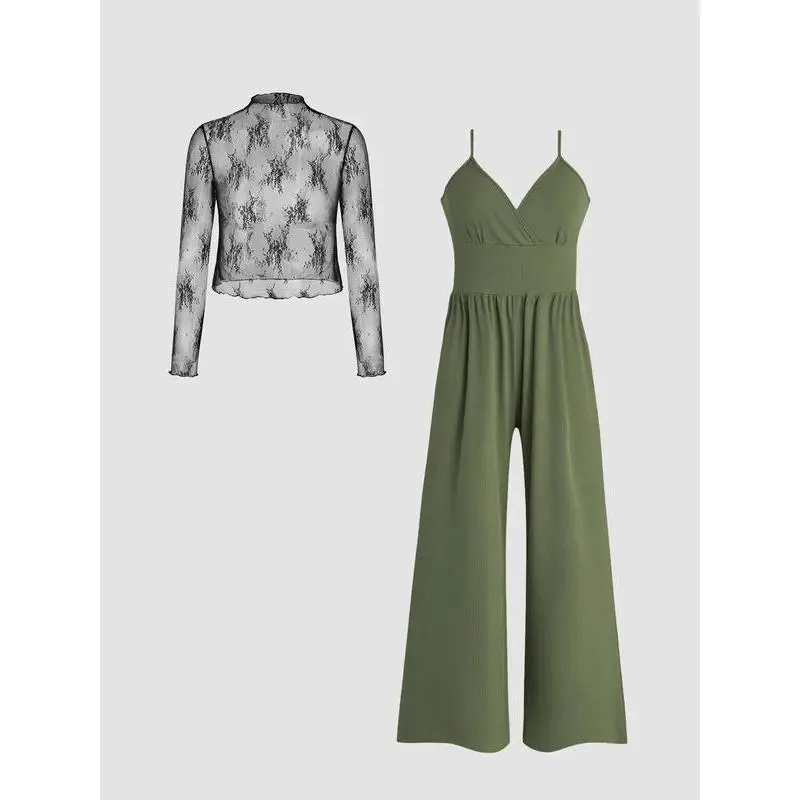 [Plus Size] Two-Piece Set Solid Lettuce Trim Lace Crop Top & Wide Leg Cami Jumpsuit, Elegant Fashion Outfits for Daily Outdoor Wear, Women Clothing for Spring Fall, Womenswear