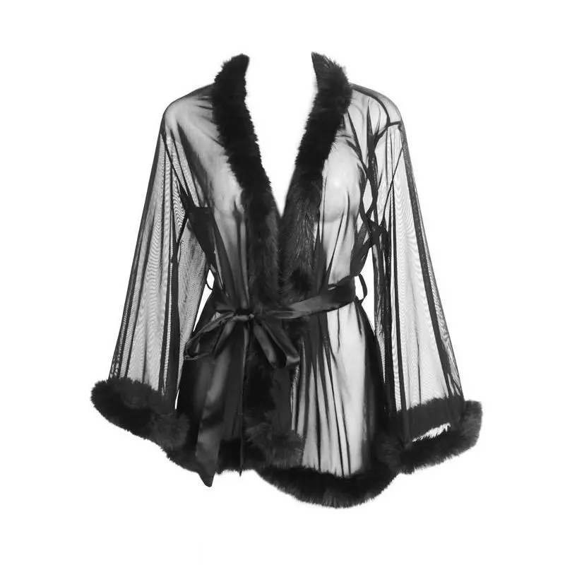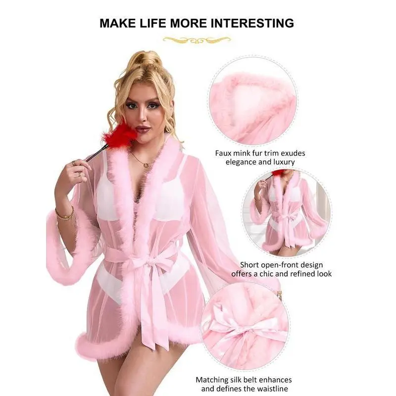 Fabric: This women's long-sleeve nightgown is made of high-quality transparent mesh fabric and faux fur Fashionable Sexy Nightgown: Transparent Nightgown, Short Sleeve Design, Slanted V-neck, Ribbon Decoration, Sleeves or Hem Trimmed with Faux Fur, Perfectly Shows Your Figure, Makes You Look More Elegant Suitable for Occasions: Perfect as a bridesmaid dress or bridal chamber dress! Ideal for Valentine's Day gifts, bridal lingerie gifts, bachelorette parties, lingerie parties, birthday parties, costume parties, maternity photoshoots, bridal chamber photoshoots, comedy performances, or late-night dates with your special partner Great Gift: The transparent mesh bathrobe can be used as a perfect gift for brides, best friends, lovers, wives, newlyweds, or as a treat for yourself on weddings, birthdays, honeymoons, Valentine's Day, Christmas, Halloween, anniversaries, and other holidays Style: Transparent Robe with Fur, Mesh Short Sleeve Bridal Kimono Robe Nightgown, Feather Bridal Robe for Wedding