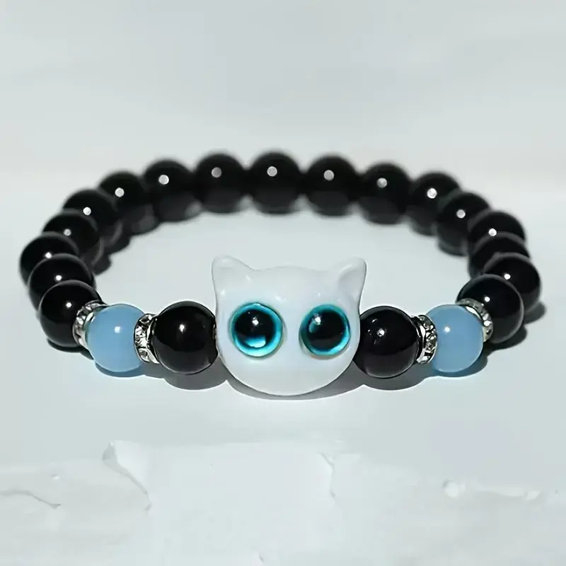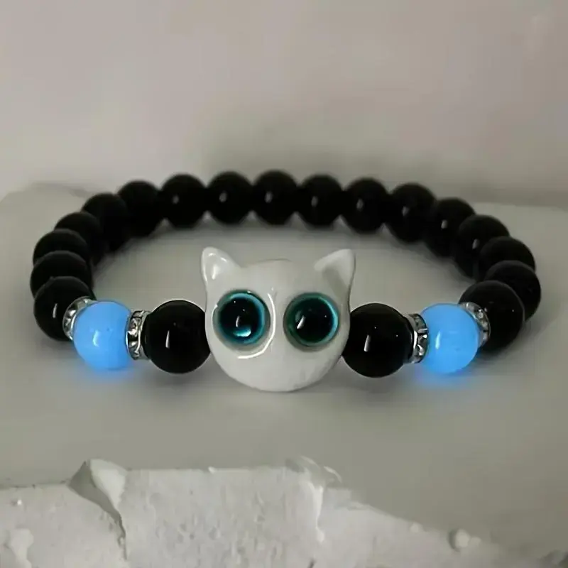2Pcs Whimsy Cat Glow-in-the-Dark Cartoon Cat Beaded Stretch Bracelet Set, Resin Rhinestone Mosaic, Glitter Style, Daily & Party Wear, Unisex Jewelry Bracelet Set Gift