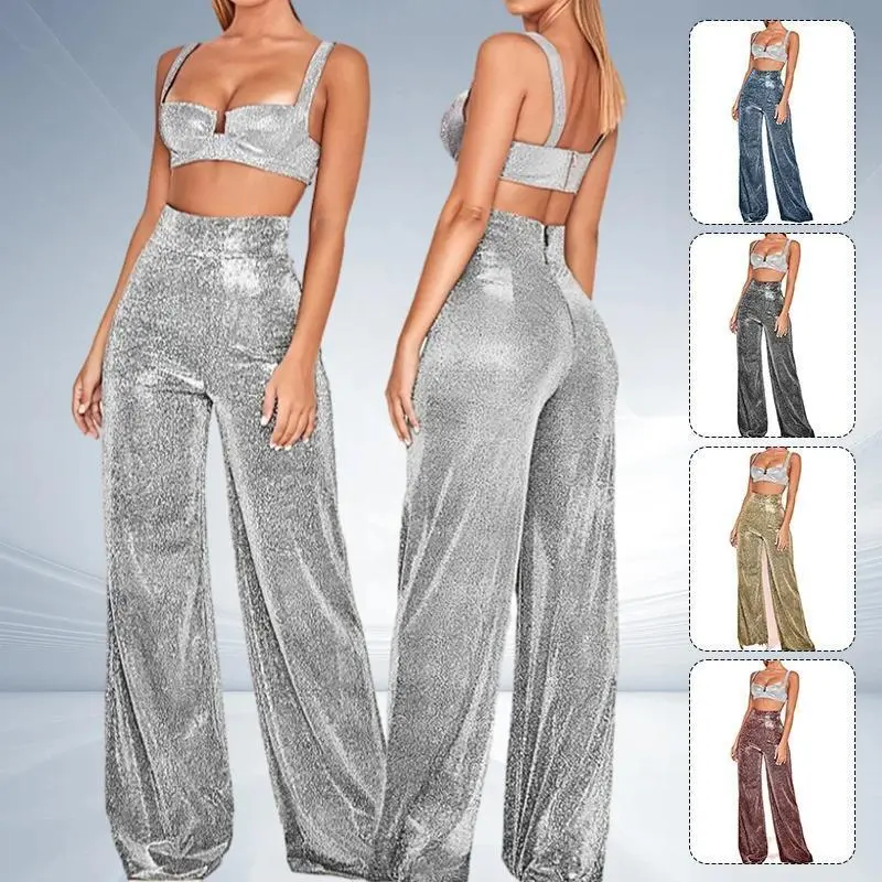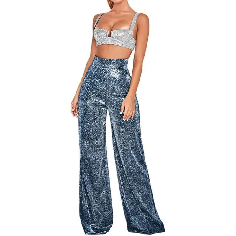 Metallic Sparkly Wide Leg Pants Women Elastic High Waist Glitter Sequin Palazzo Pants Casual Loose Party Clubwear Long Trousers Bottoms Womenswear Basic Minimalist Bottoms