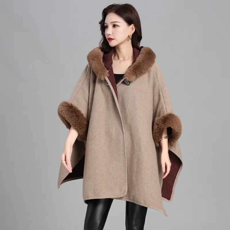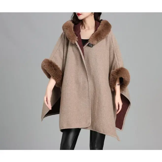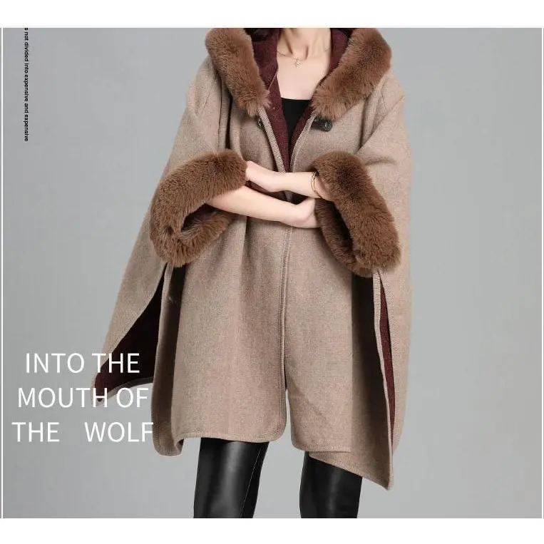 Women's Faux Rabbit Fur Collar Hooded Cape Cardigan - Thick Loose Longline Knit Fur Coat Casual Casual Womenswear Jackets