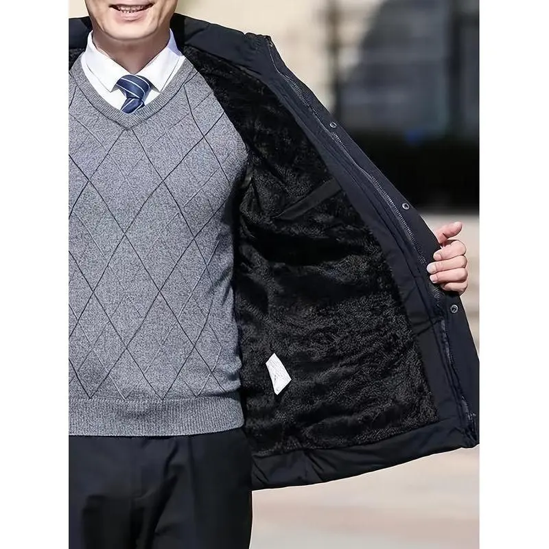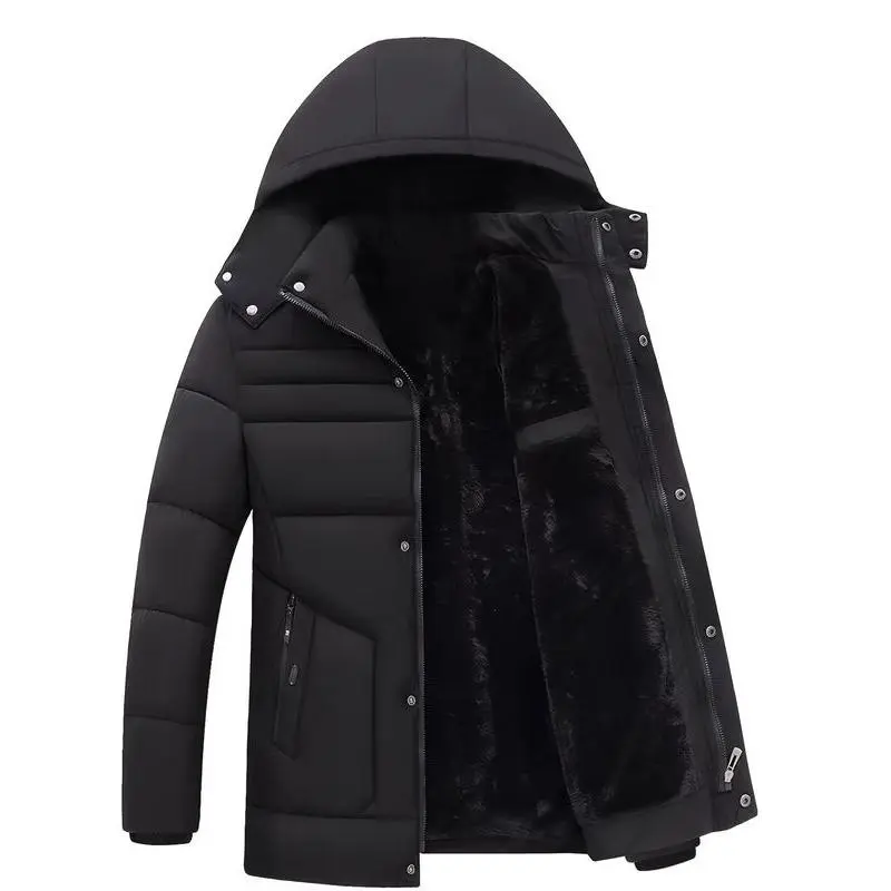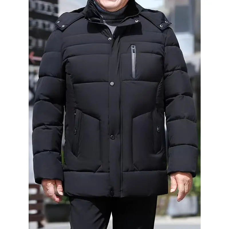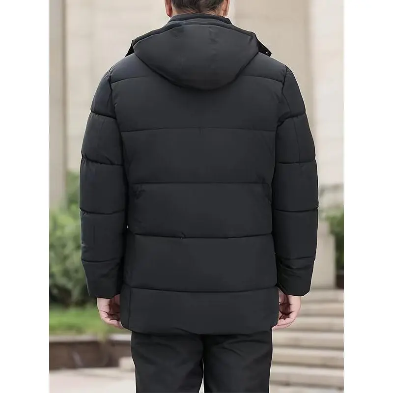 Long Winter Jacket for Men & Women - Windproof Polyester Coat with Removable Hood, Multiple Pockets, and Fleece Lining - Classic Black Overcoat Suitable for Seniors and Older Adults