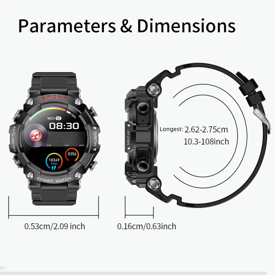 BUILT-IN EARBUDS: Comes with ergonomic in-ear wireless earbuds, featuring bi-directional noise cancellation and HIFI 9D sound quality for clearer calls, with a watch compartment for convenient charging and on-the-go use.