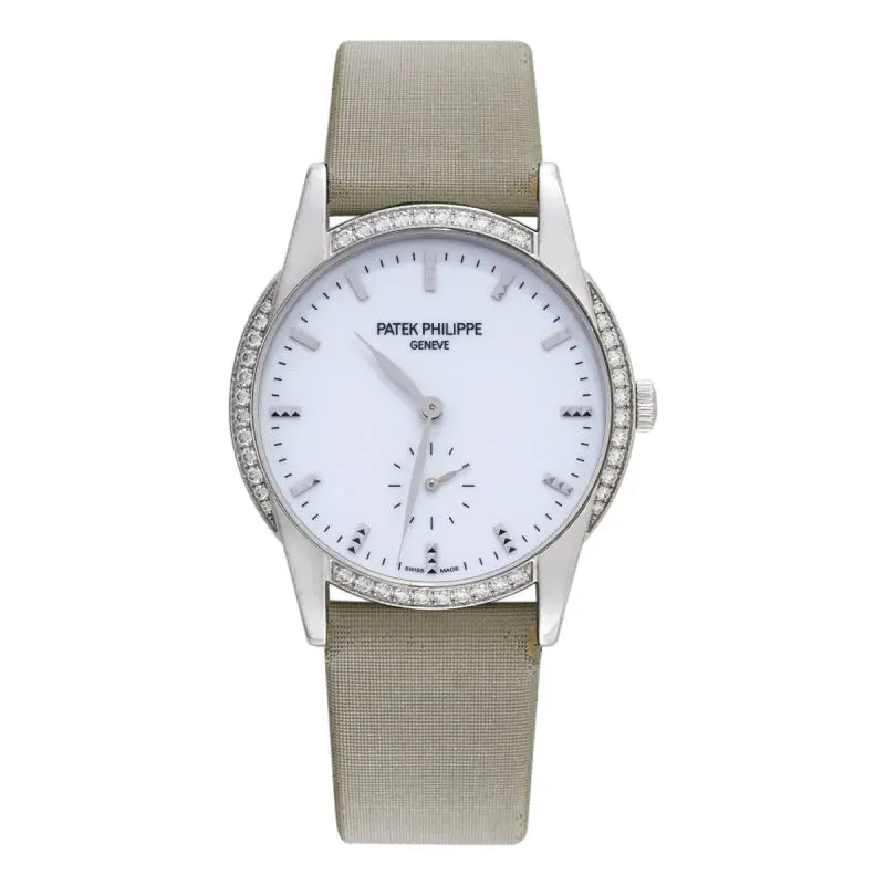Discover the Patek Philippe Calatrava 7122/200G-001, a manual winding watch designed for discerning ladies. This 33mm timepiece features a pristine white dial, exuding sophistication. Crafted with 18K white gold, it offers a luxurious touch. The factory diamond adds a sparkling allure. Perfect for those who appreciate fine craftsmanship.