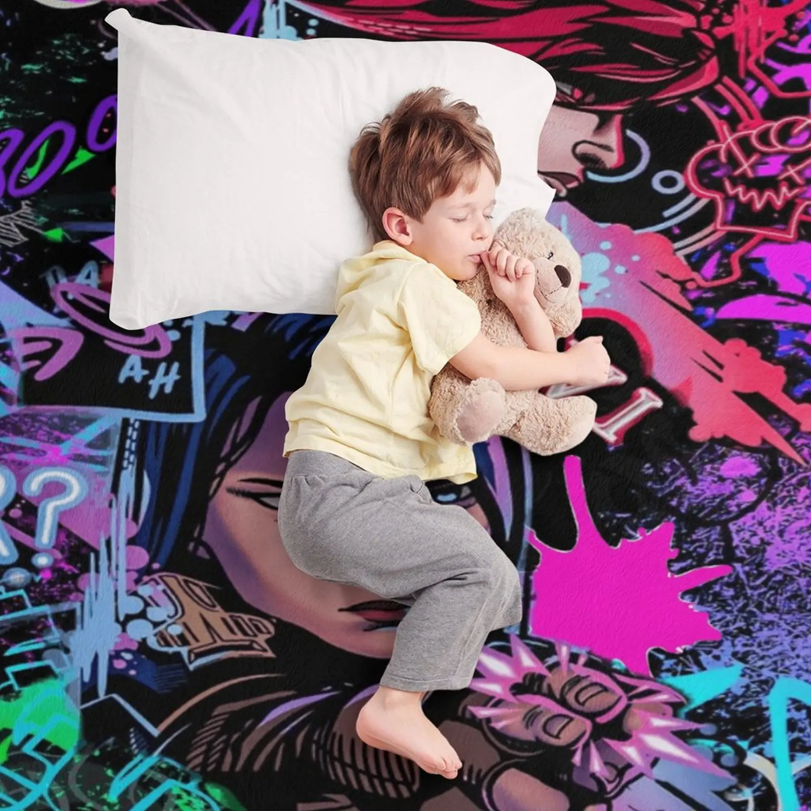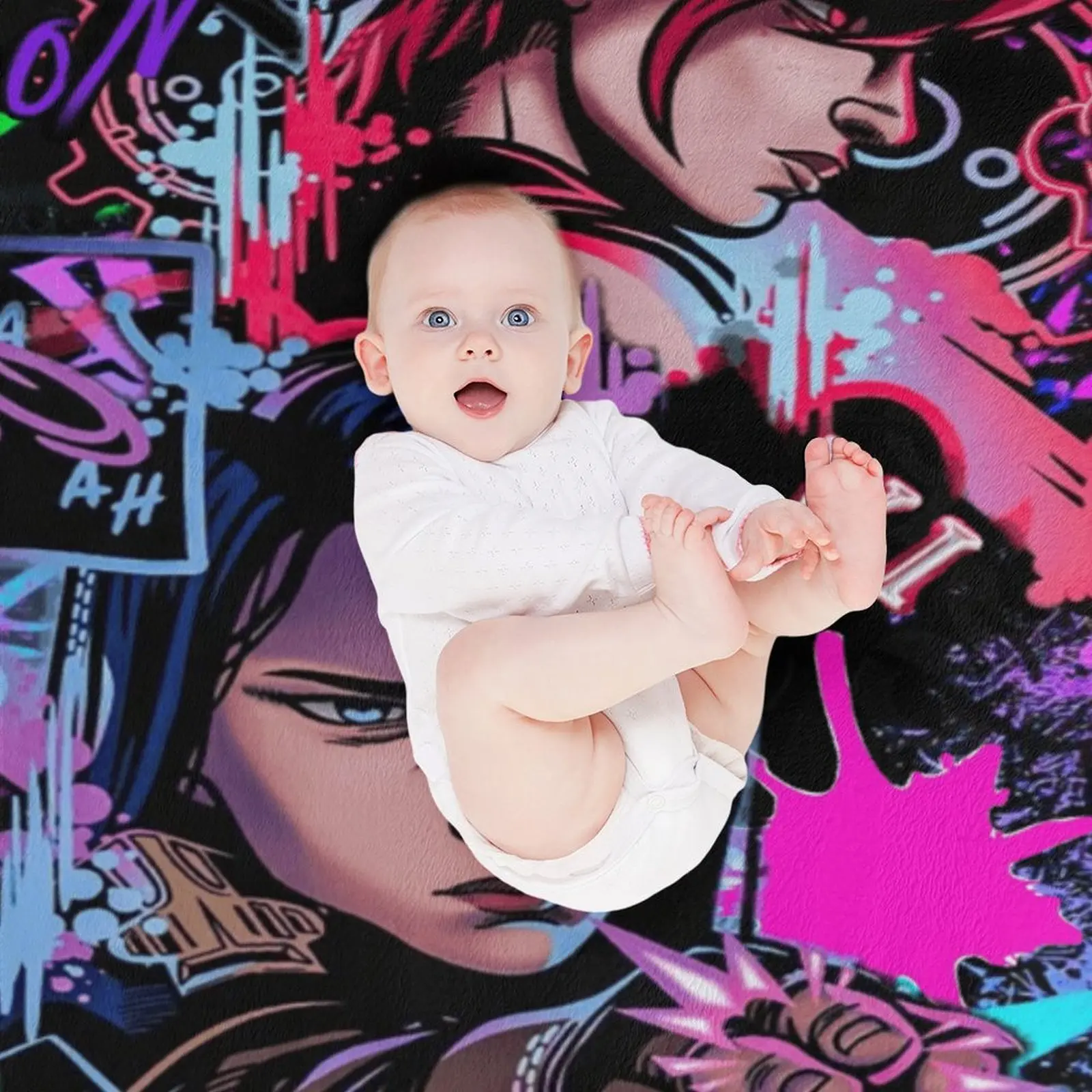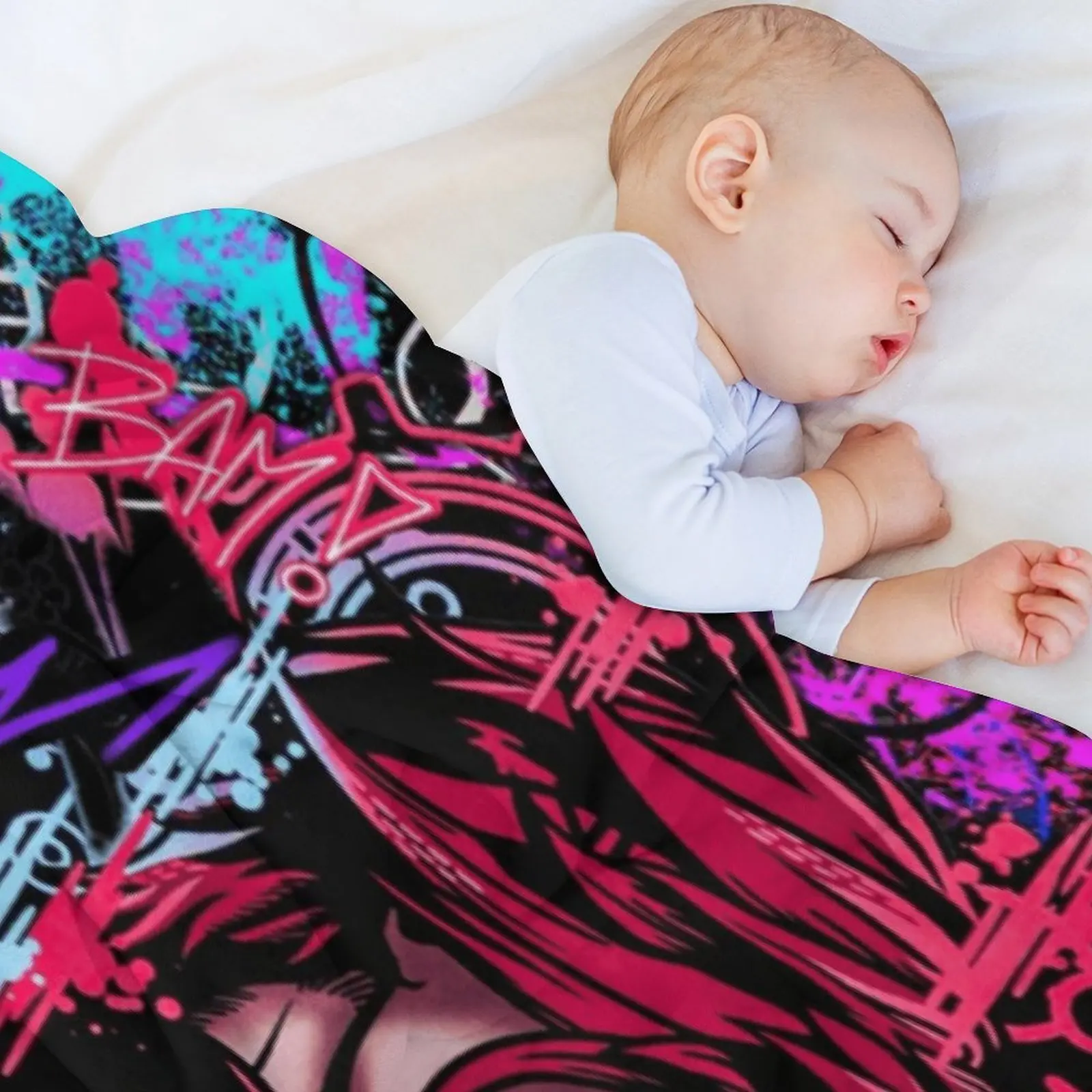 "Arcane" Jinx & Vi Graffiti Flannel Blanket — A Soft, Casual Throw. An Edgy, Neon-Punk Style Fleece Blanket Featuring Game Characters—A Unique Gift for Fans with an Aesthetic Sensibility. A Comfortable, Warm Throw Blanket for Sofas and Beds.