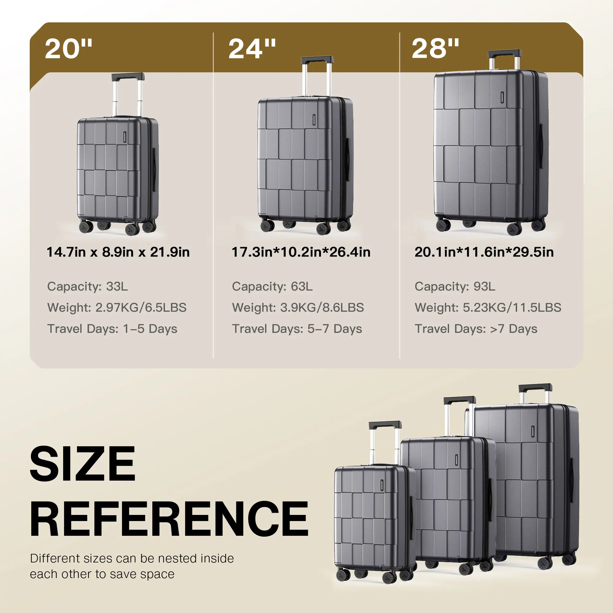 ·28” (93L) – Expandable up to 20% more capacity