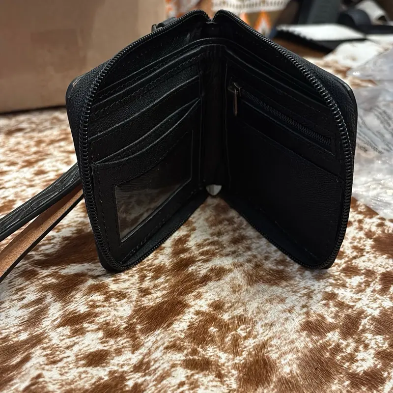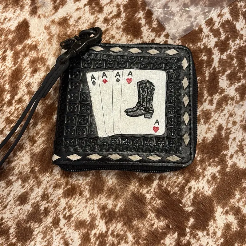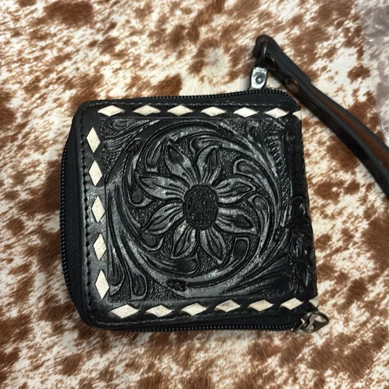 Small black tooled wallet with white whip stitching featuring cards design