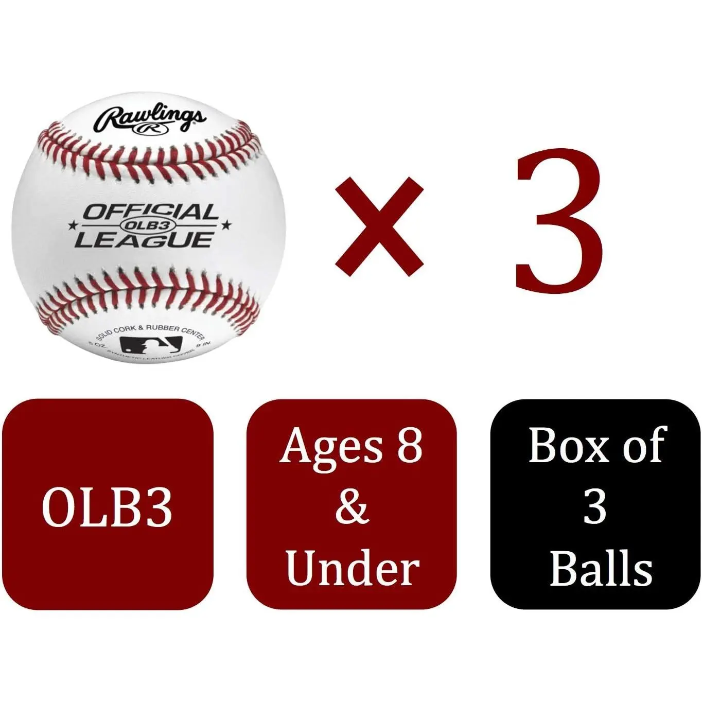 Ideal for batting practice or playing casual games, this set of Rawlings Official League Recreational Use Baseballs contains 3 baseballs.Each practice baseball features a solid cork and rubber center and synthetic leather cover.These baseballs are official size and weight.The Rawlings OLB3 Recreational Use Baseballs are designed with a solid cork and rubber center and a synthetic leather cover to create an easy grip in addition to major league seams.They are suitable for recreational use of ages 8 and under.They are official size and weight and are the#1 choice of leagues, coaches, parents, and players in North America.