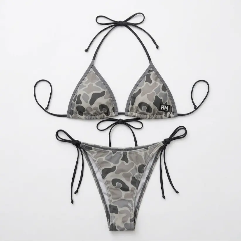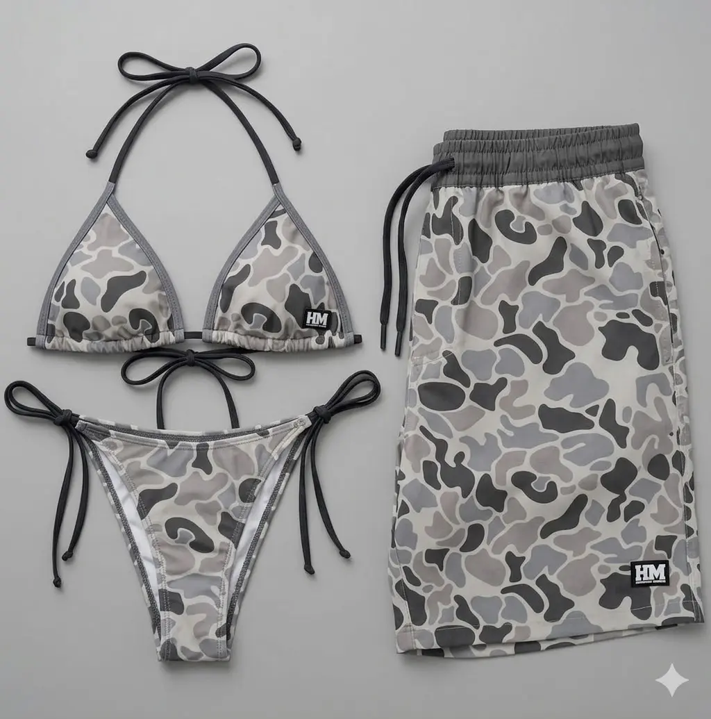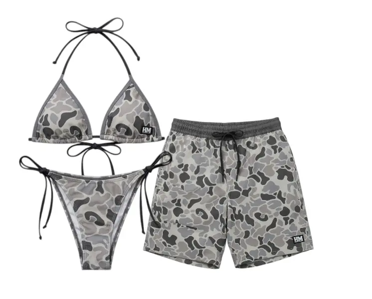 This set includes a sexy triangle tie swimwear for her and men’s drawstring beach shorts. Ideal for a summer vacation, it’s a matching outfit for him and her. The camo design adds a trendy touch to your beachwear. Perfect for couples looking to enjoy the sun together.