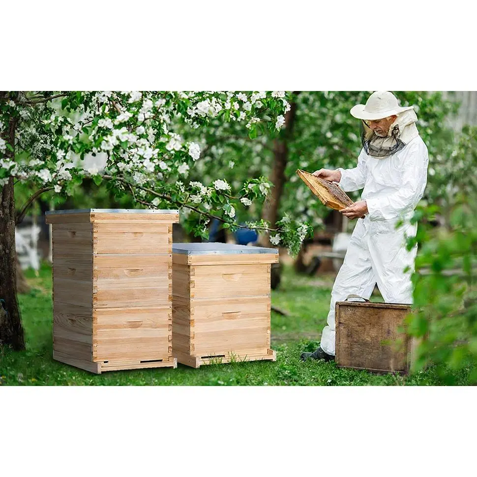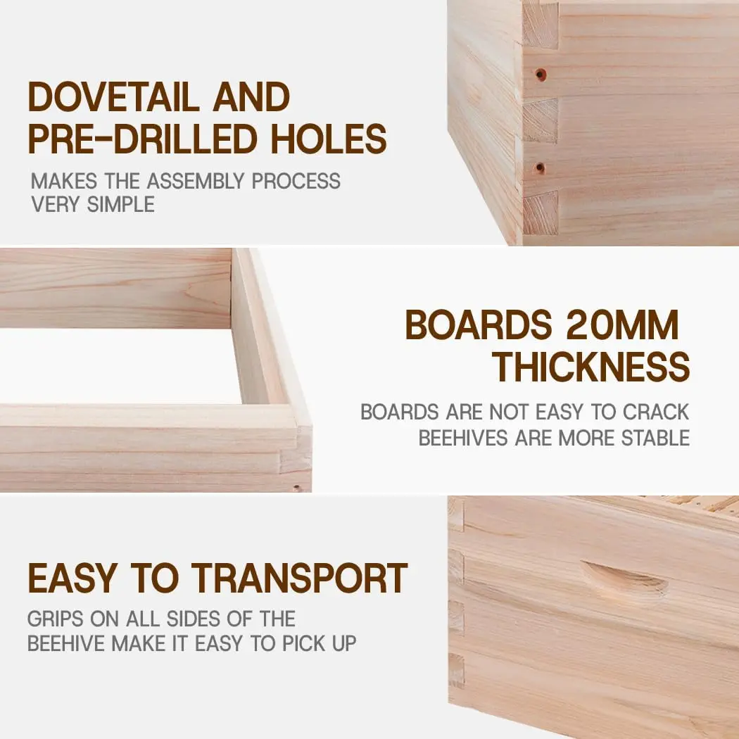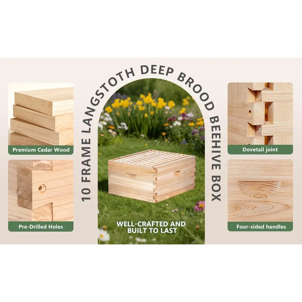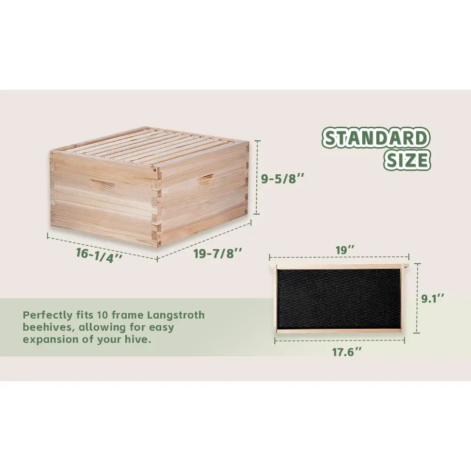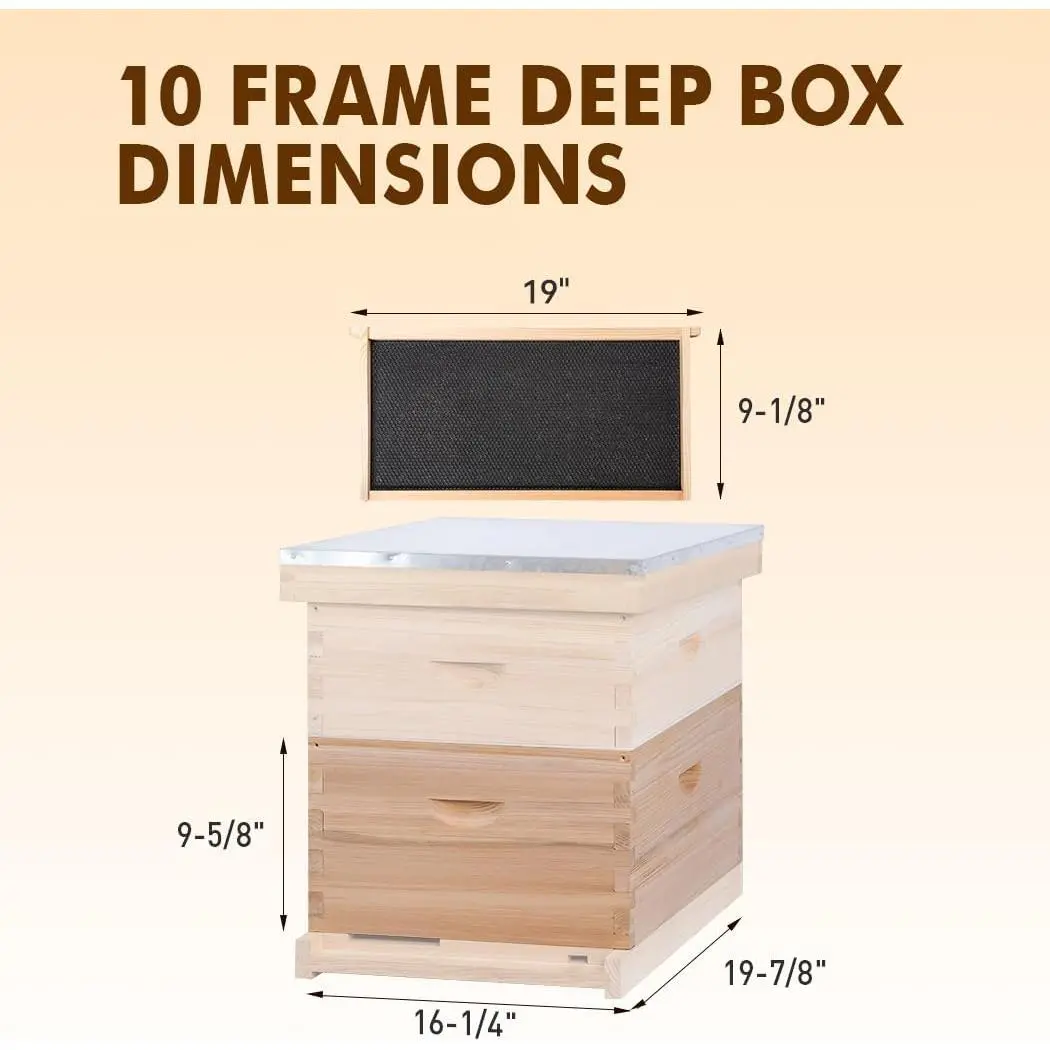 Premium Material: Beehive 10 frame deep box is crafted from cedar wood, ensuring durability and longevity to meet all your beekeeping needsEasy Installation: This deep box comes complete with the necessary tools and heavy duty nails.Dovetail construction and pre-drilled holes allow for quick and easy assemblyFrames with Foundations: Our beehive comes with removable solid wood frames and beeswax coated plastic foundations,making it easy for the bees to build a hive quicklyPerfect Fit: With dimensions of 16-1/4’’ x 19-7/8’’ x 9-5/8’’, deep box is engineered to fit standard 10-frame Langstroth beehiveIncreased Efficiency: Beehive box have handles on all sides for easy handling and provide beekeepers with the flexibility they need for maintenance and upkeep