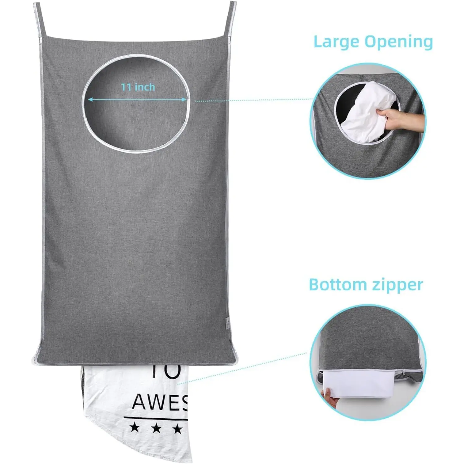 【Easy to Use】This over-the-door hamper bag is designed for convenience. It features a wide opening for easy loading of laundry and a smooth bottom zipper for quick unloading when full. When not in use, it easily folds flat for compact storage.