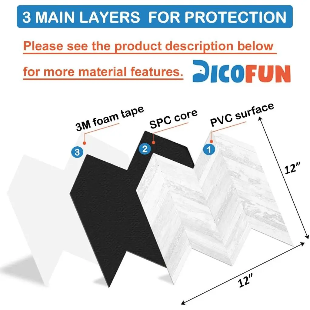 DICOFUN PVC tiles are made of PVC surface, composite of stone plastic core and the back of tile is 3M foam tape.