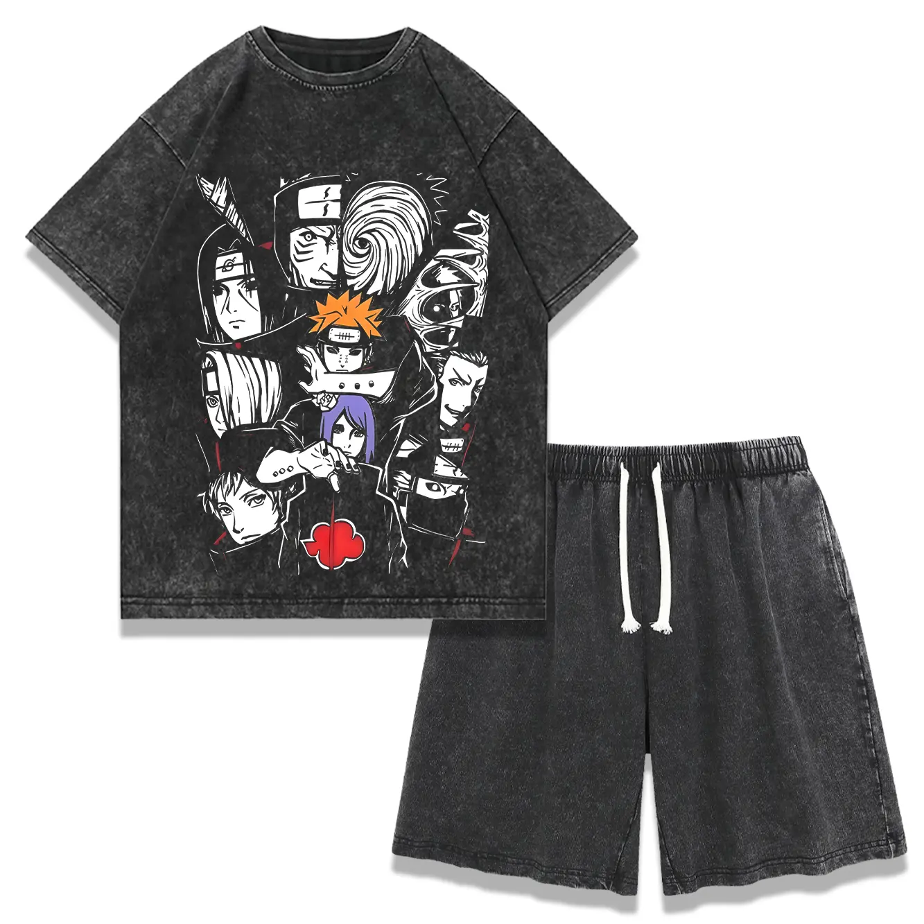 5. Retro Akatsuki Naruto 2-Piece Set, Unisex Vintage Wash Anime Graphic Tee & Shorts, Trendy Street Style Summer Outfit