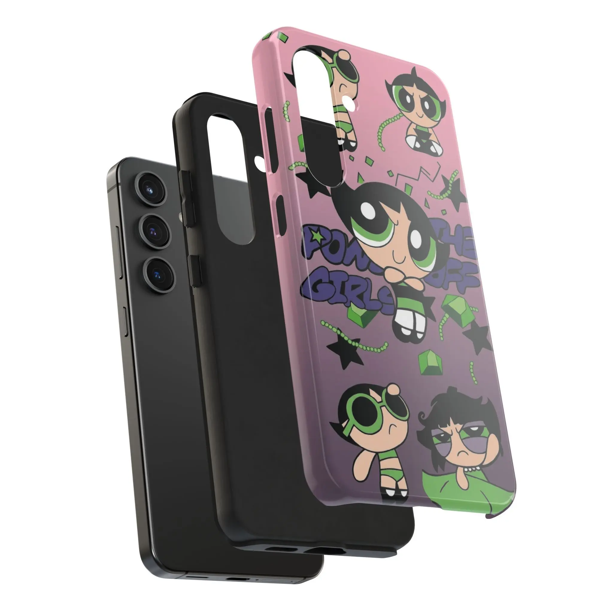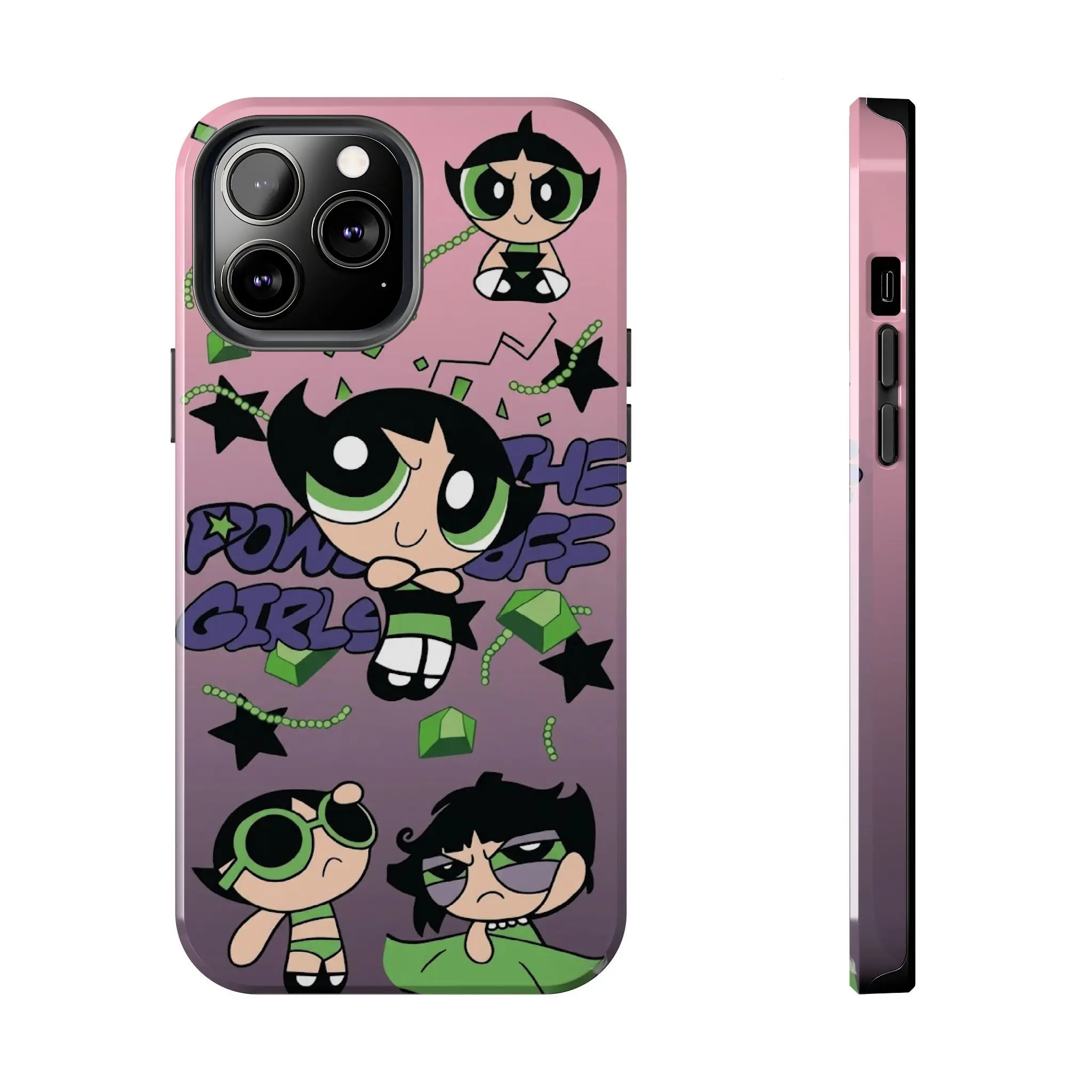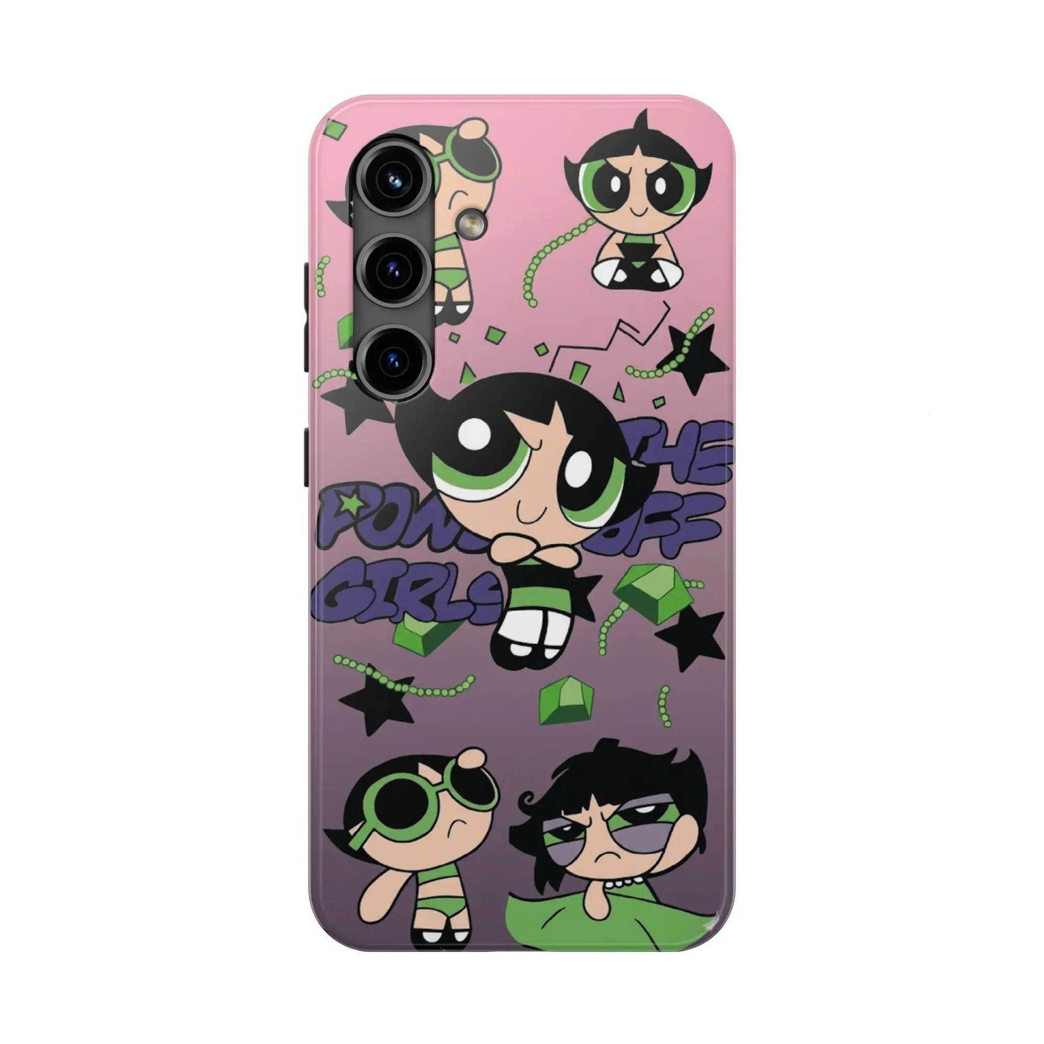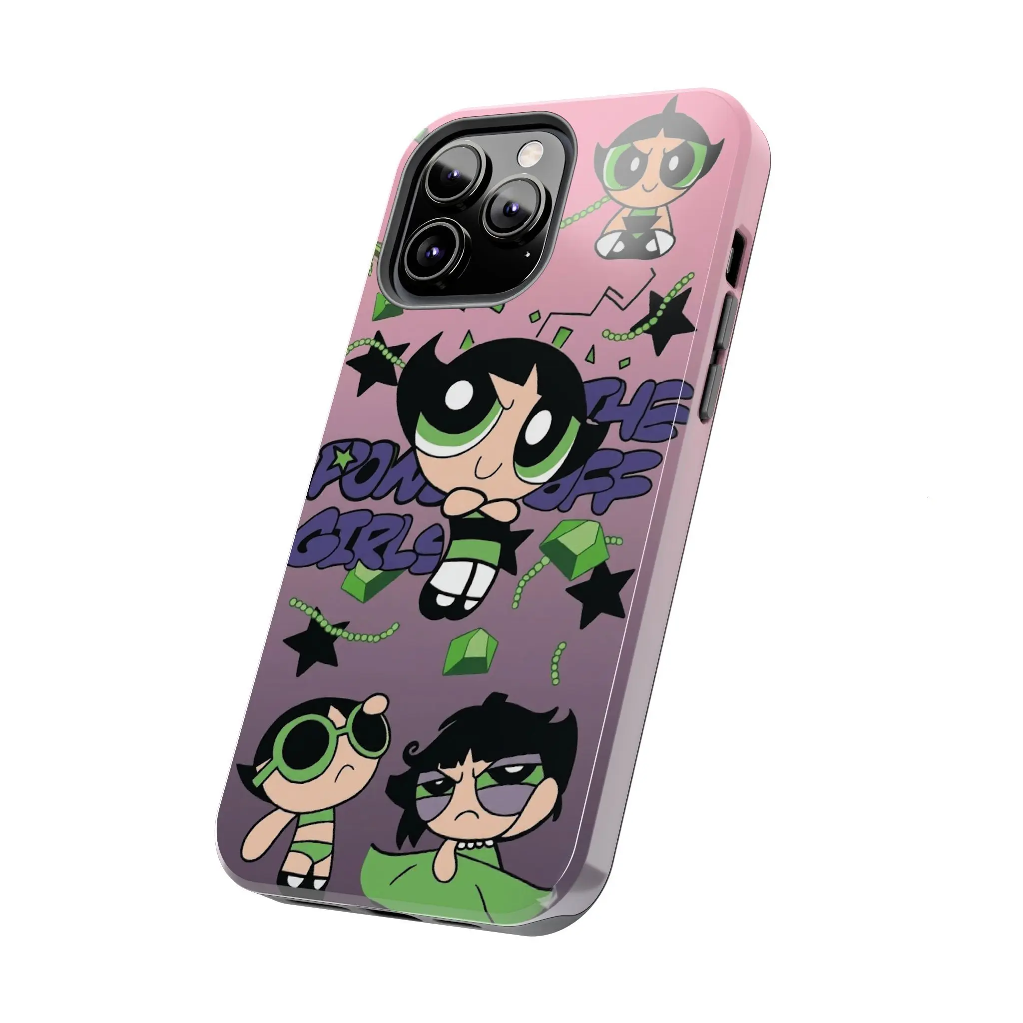 Embrace your rebellious side with this Buttercup "The Powerpuff Girls" themed case. Featuring the iconic green-clad heroine in her signature tough-as-nails attitude, this design blends retro Y2K vibes with a modern aesthetic collage. With a bold purple-to-pink gradient background and edgy graphic elements, it’s the perfect accessory for fans who love a mix of cute and "don't mess with me" energy.