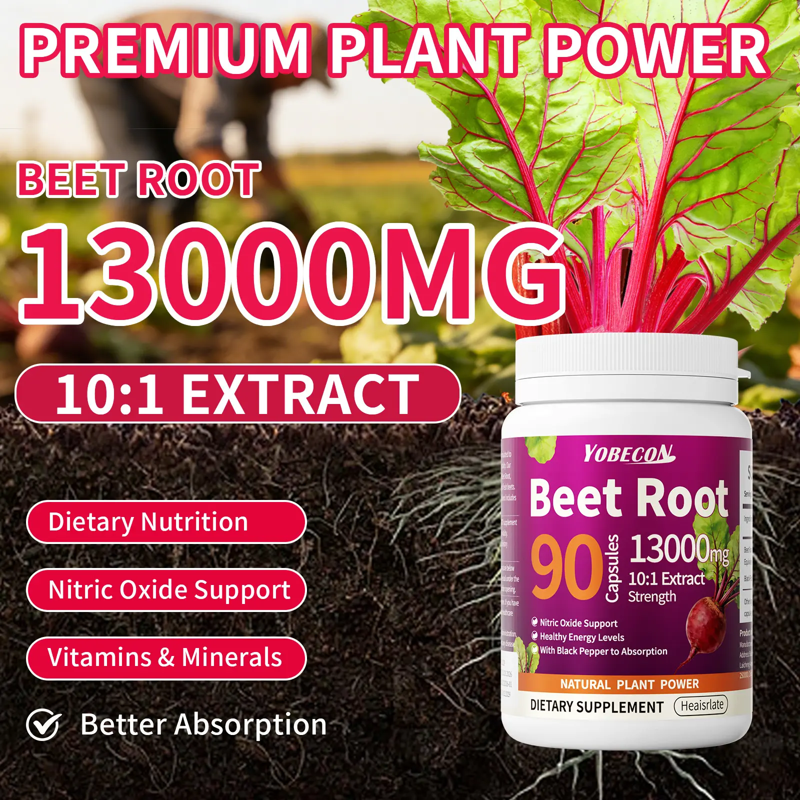 90 Natural Nitric Oxide Beetroot Capsules - Each capsule contains 13,000 mg of highly effective ingredients - Plant-based formula, effectively regulates blood pressure, promotes intestinal digestion and metabolism, boosts energy.
