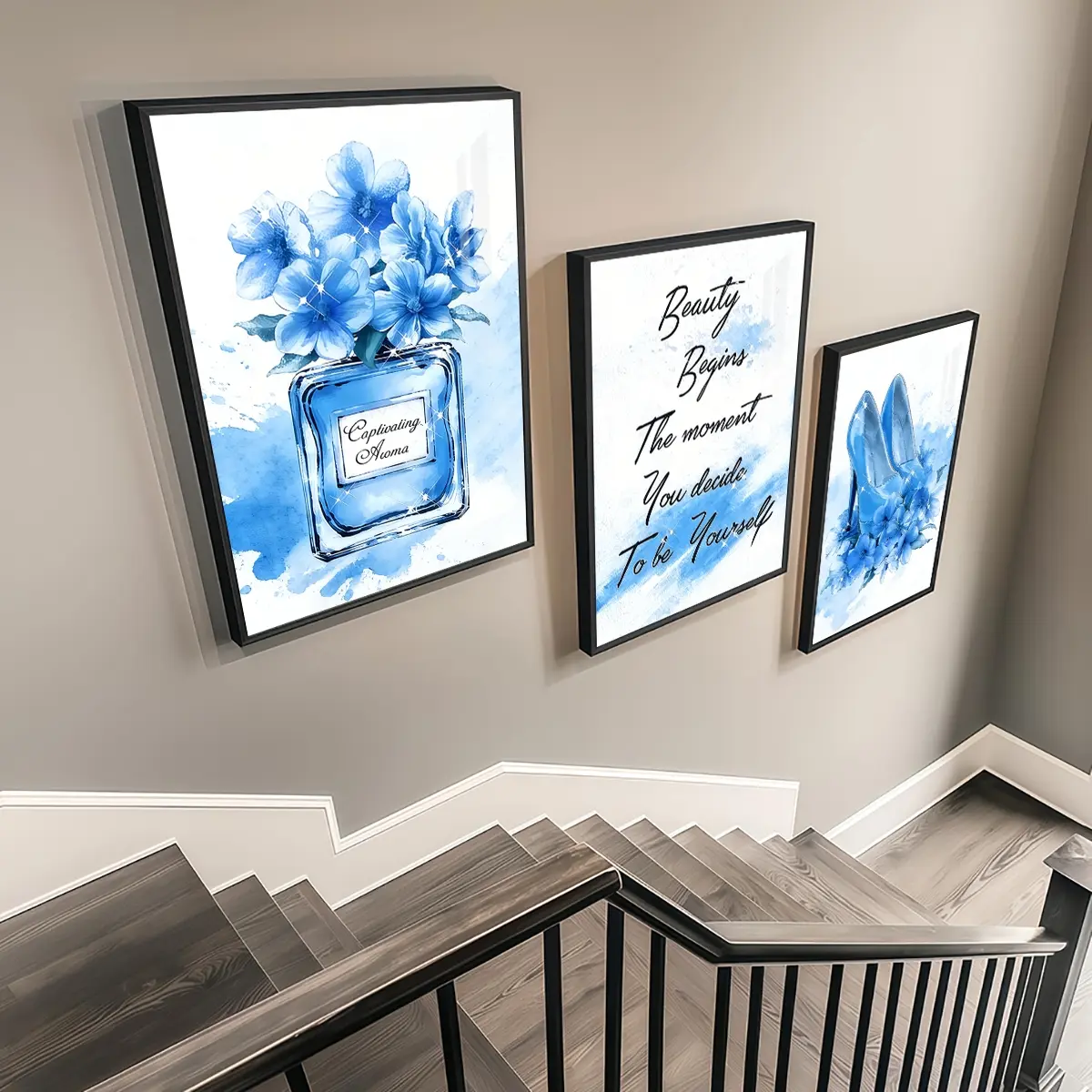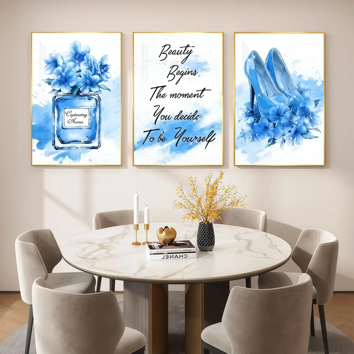 3 Counts Aluminum Alloy Framed Painting, Blue High Heels Perfume And Flowers Illustration, Home Decoration For Living Room, Bedroom, Office, Restaurant, Hallway Wall Decor, Odorless Print Artwork, Luxury Perfect Gift For Friends And Family