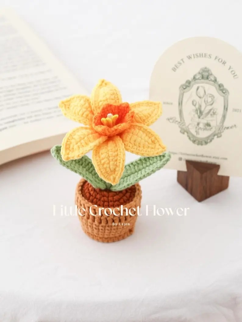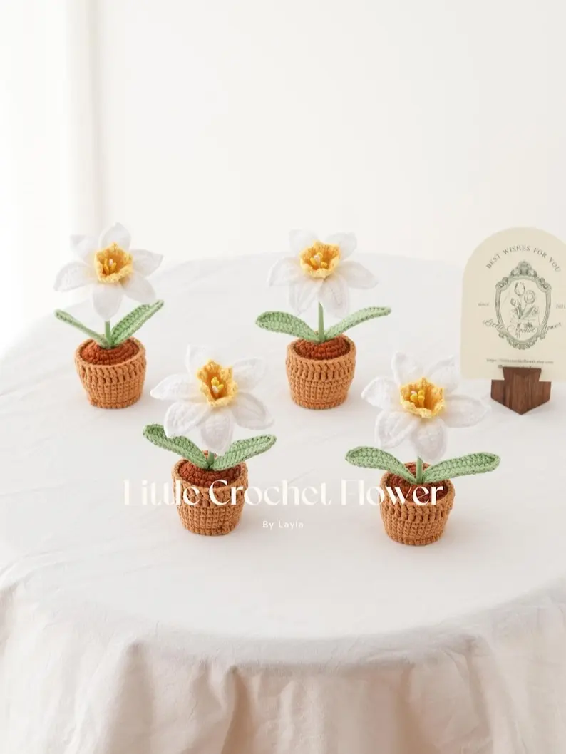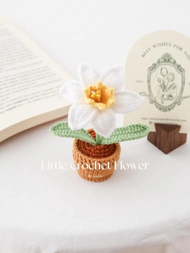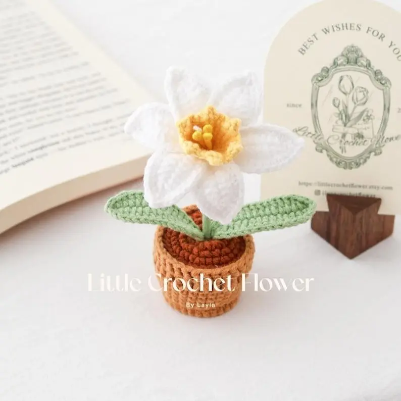 Handmade Crochet Daffodil in Pot, Personalized Teacher Gift, White Yellow Flower Desk Decor, Cute Knitted Floral Gift, Office Table Decoration