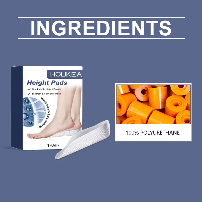 Our insoles are meticulously crafted from100% polyurethane. Specifically engineered for instant height elevation to boost confidence, they evenly distribute plantar pressure, reduce fatigue, and improve gait. The usage is incredibly convenient: simply insert the insole into your shoe and wear it. Offering comfortable support, the invisible design discreetly adds height without being noticeable. Durable and compatible with various shoe types, they are suitable for different occasions.