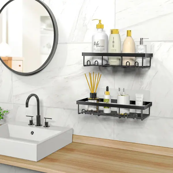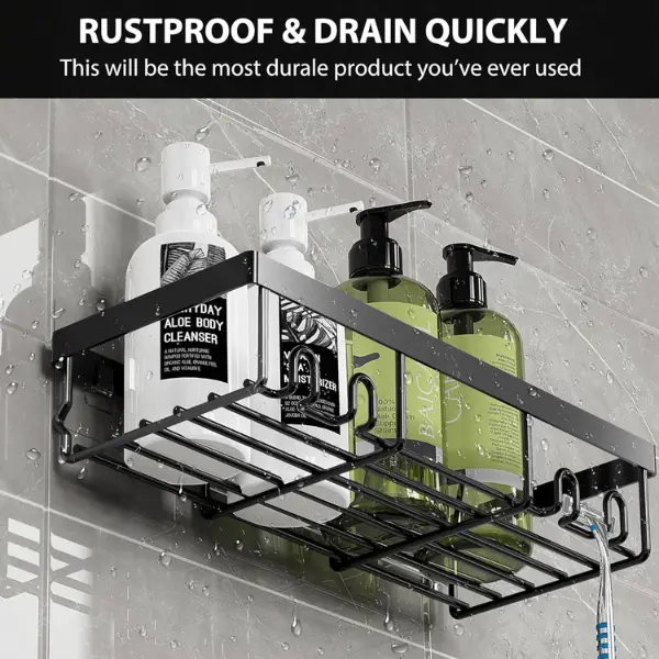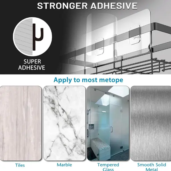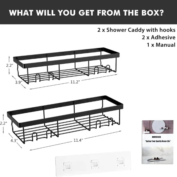 Complete Set Included – Comes with 2 shower caddies, adhesive mounts, and hooks for extra storage. Easy setup in minutes.