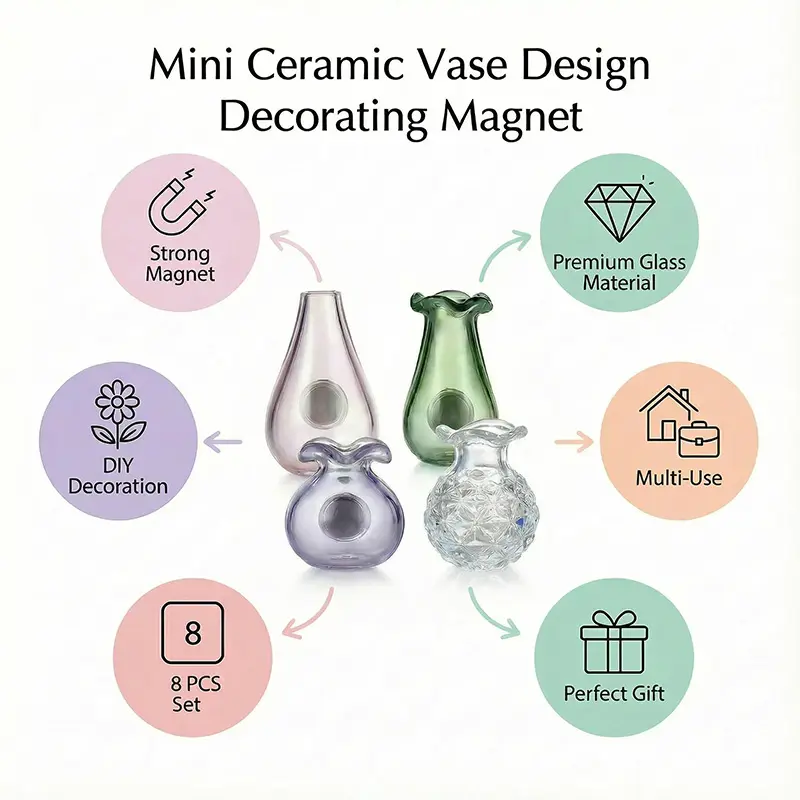 Adorable Mini Vase Magnets:8pcs cute glass vase‑shaped fridge magnets with vibrant & lifelike designs, made of non‑toxic, eco‑friendly, waterproof materials for safe and long‑lasting use. Built with strong magnetic hold to securely stick notes, photos and reminders on fridges, lockers or whiteboards; stylish, functional and decorative to organize your space with a lovely touch, an ideal gift for plant lovers on birthdays, holidays and daily gifting.