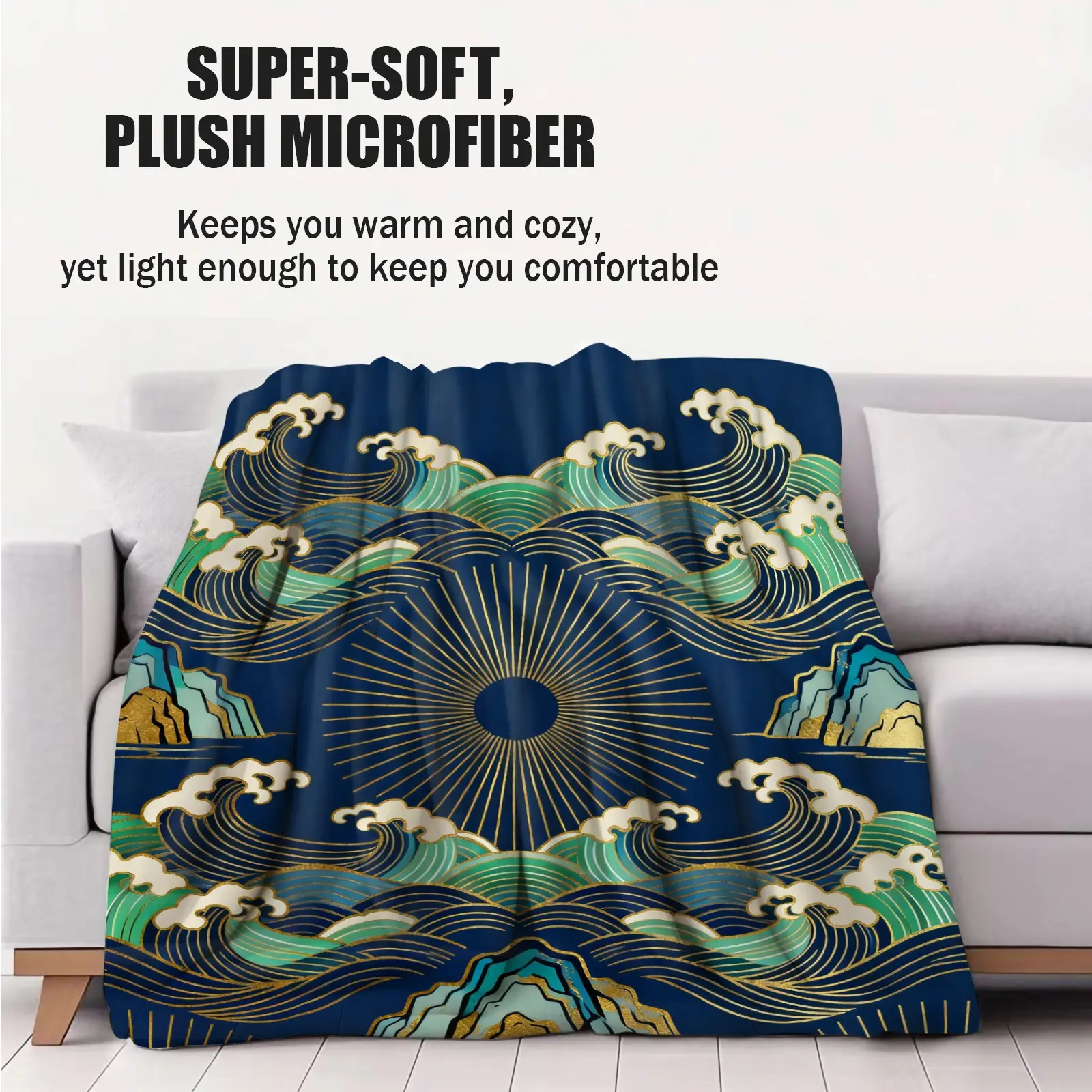 5. 1 Piece Japanese Wave Sun Blanket, Navy Blue Gold Foil Great Wave HD Digital Single-Sided Print Flannel Throw Blanket, Super Soft Plush Warm Blanket for Couch Bed Travel, Multipurpose Cozy Gift Blanket