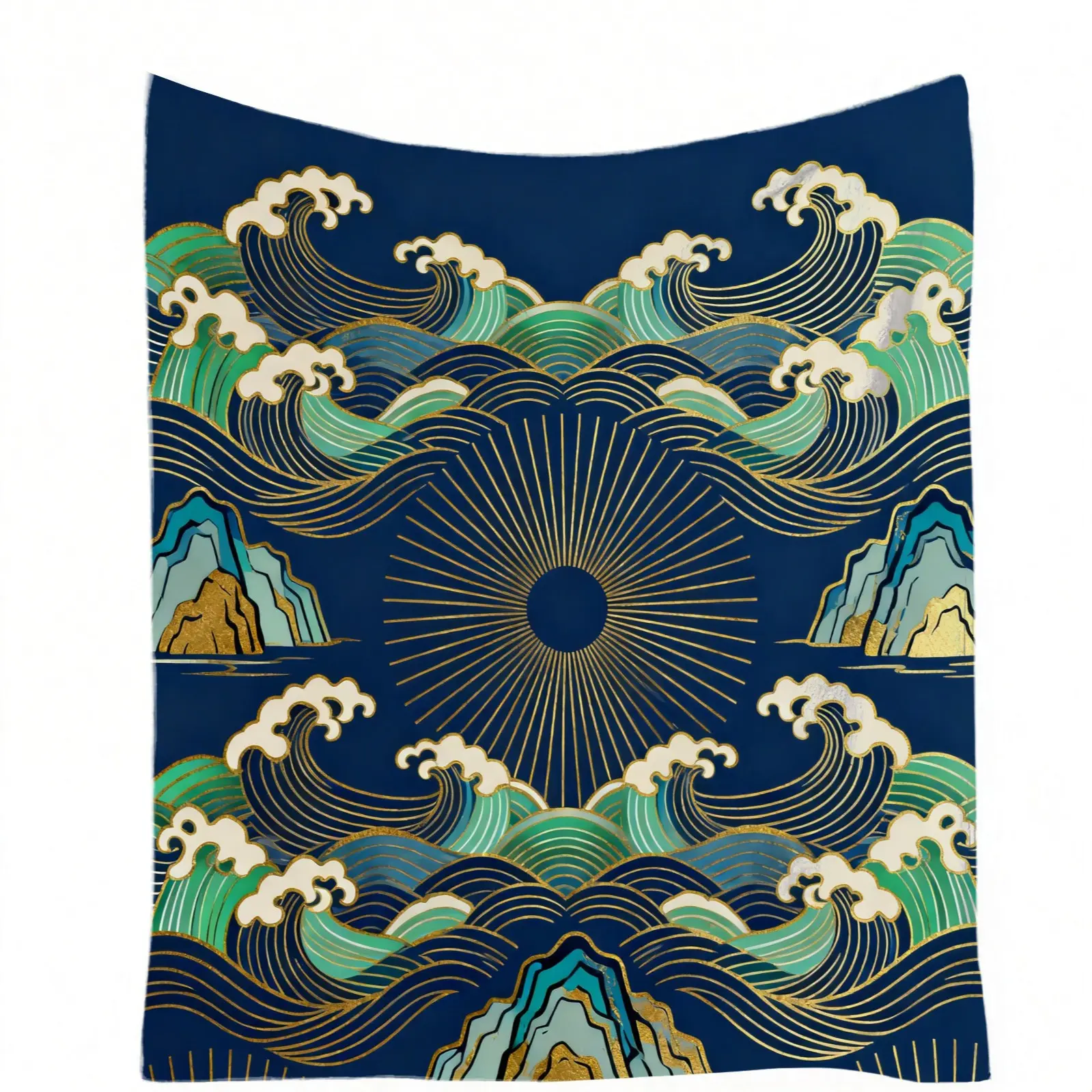 1 Piece Japanese Wave Sun Blanket, Navy Blue Gold Foil Great Wave HD Digital Single-Sided Print Flannel Throw Blanket, Super Soft Plush Warm Blanket for Couch Bed Travel, Multipurpose Cozy Gift Blanket