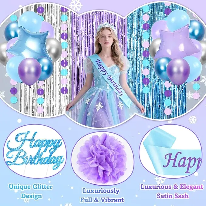 Blue and Purple Birthday Decorations, 50PCS Winter Birthday Party Decorations with Blue Purple Silver Balloons Banner Sash Fringe Curtain, Winter Wonderland Decorations Party Supplies for Women Girls