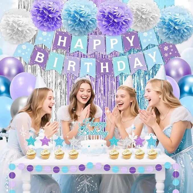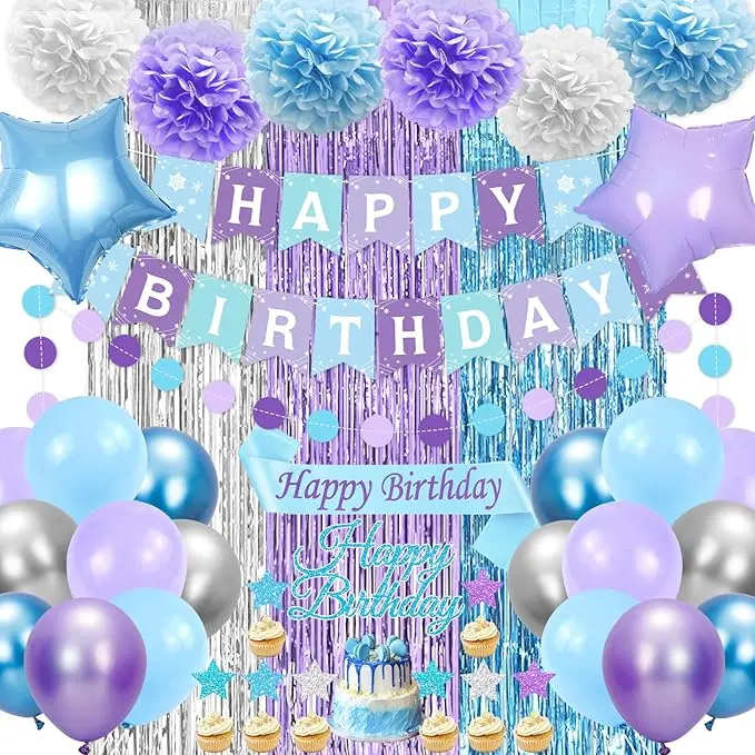 ·All-In-One Winter Birthday Party Decorations: This blue and purple birthday decorations set includes 1pcs "HAPPY BIRTHDAY" banner, 1pcs circle garland, 1pcs sash, 1pcs blue purple and silver foil fringe curtain, 6pcs paper pompoms, 2pcs star foil balloons, 25pcs latex balloons, and 9pcs glitter cake toppers. Comes with tools for easy setup. Celebrate your special moments with these purple and blue birthday decorations.