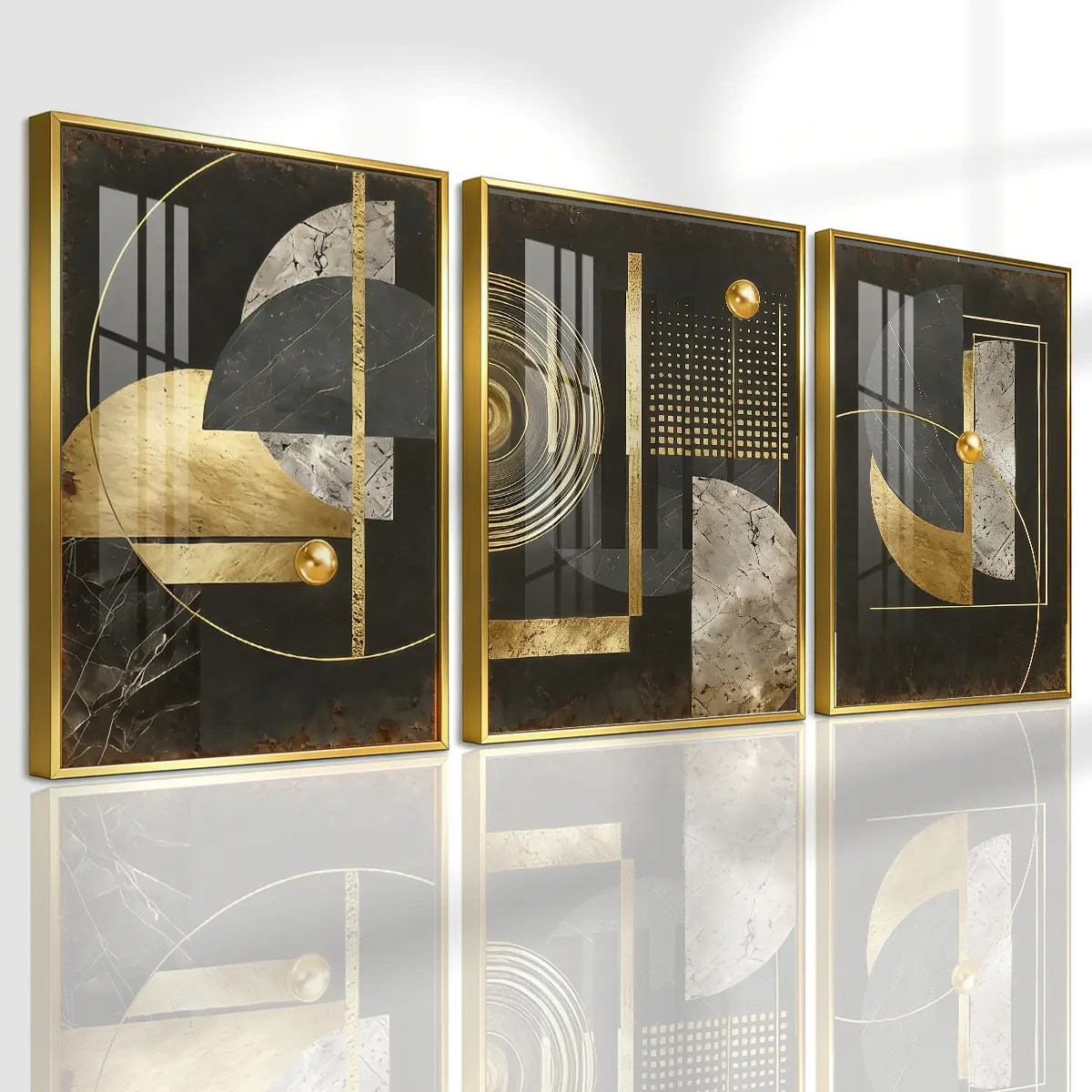 3 Counts Aluminum Alloy Framed Painting, Abstract Geometric Gold And Black Art Pictures, Home Decoration For Living Room, Bedroom, Office, Restaurant, Hallway Wall Decor, Odorless Print Artwork, Luxury Perfect Gift For Friends And Family