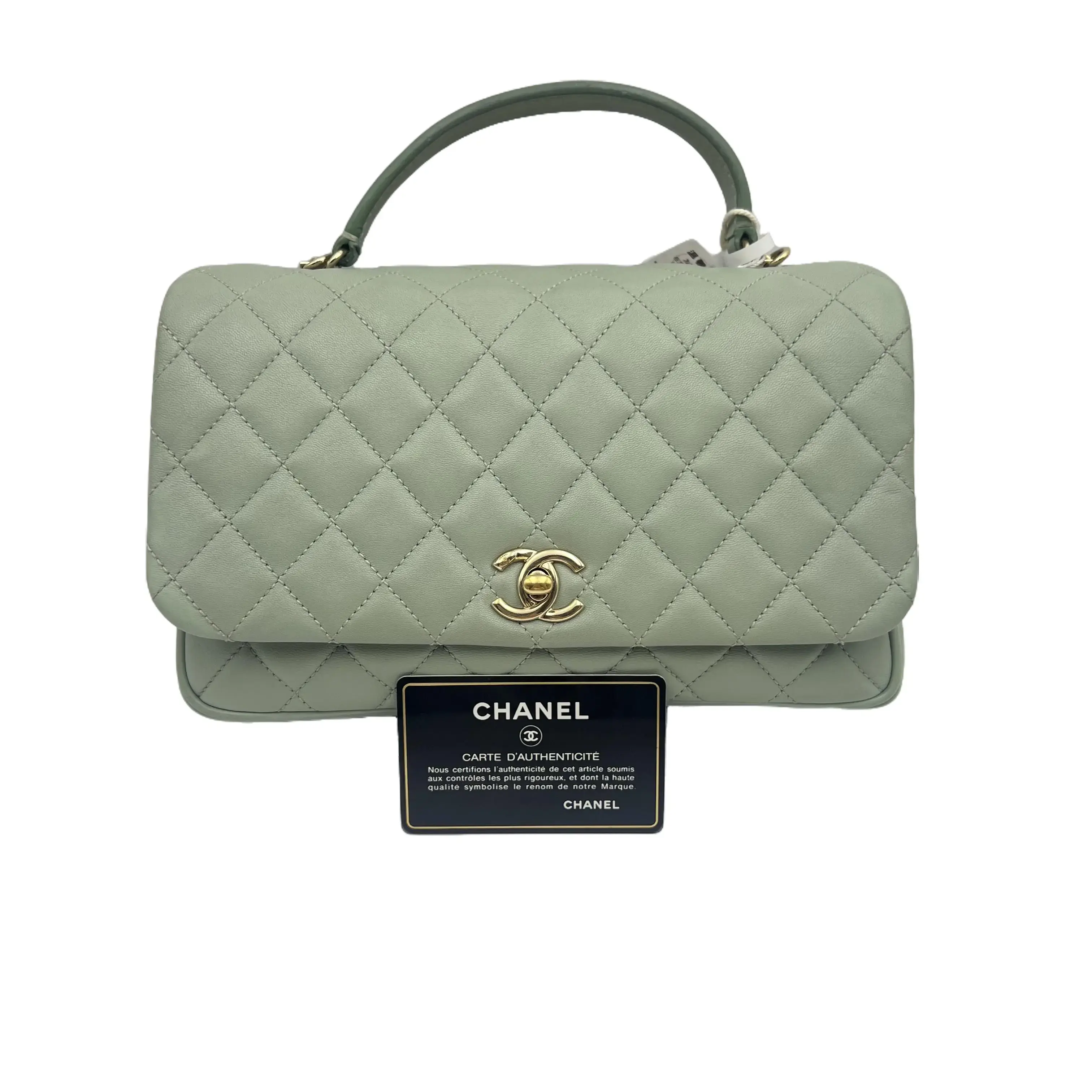 Discover the h5 Chanel Coco Handle Handbag/Crossbody Bag, a stylish accessory in green with gold hardware. This versatile bag is perfect for both hand-held and crossbody use. The design combines functionality with fashion, making it a standout piece. Ideal for those who appreciate chic, practical accessories.