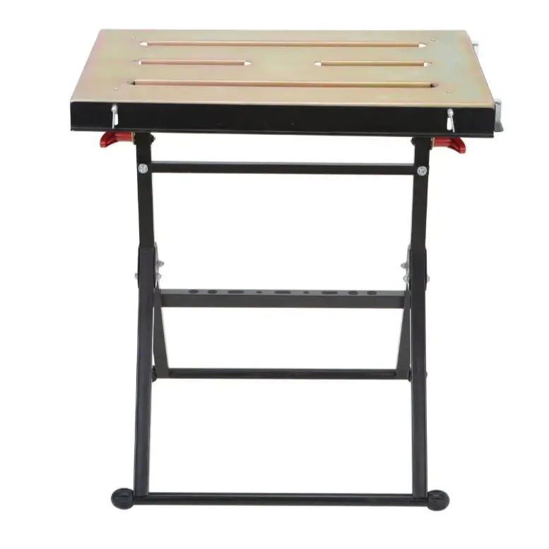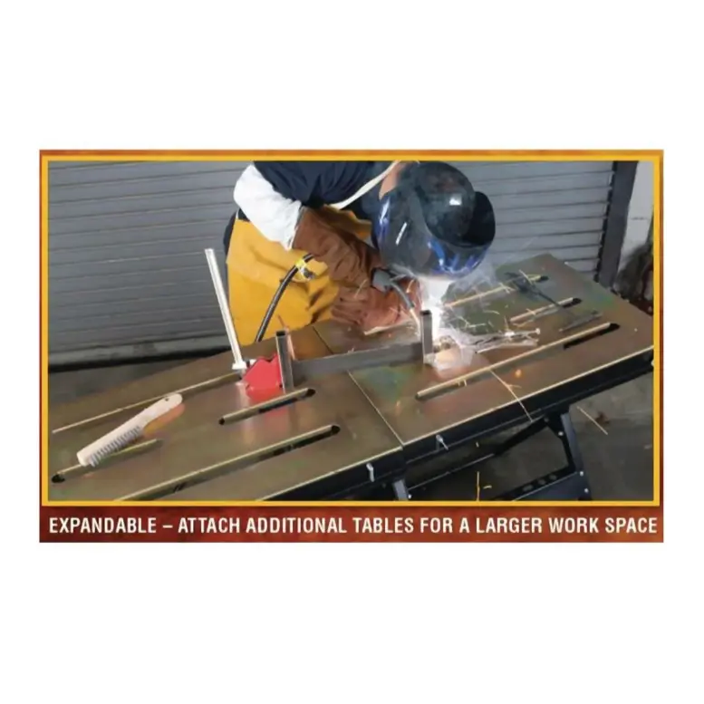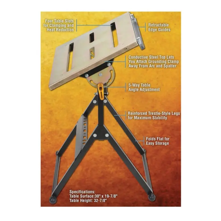 The steel surface of this adjustable welding table gives you a steady, flameproof surface for welding parts and components. Designed for conductivity, connect your welding clamp directly to the welding table safely out of the way of slag and spatter. Adjustable angle and fence give you a variety of welding options.