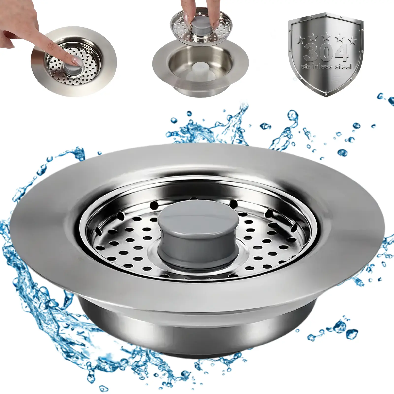 ·【 Simplify Your Kitchen Routine】3-in-1 kitchen sink drain strainer Versatile Functionality brings effortlessly switch between three modes with a single press: store water for washing, drain quickly while filtering food scraps, and block odors to keep your sink fresh.