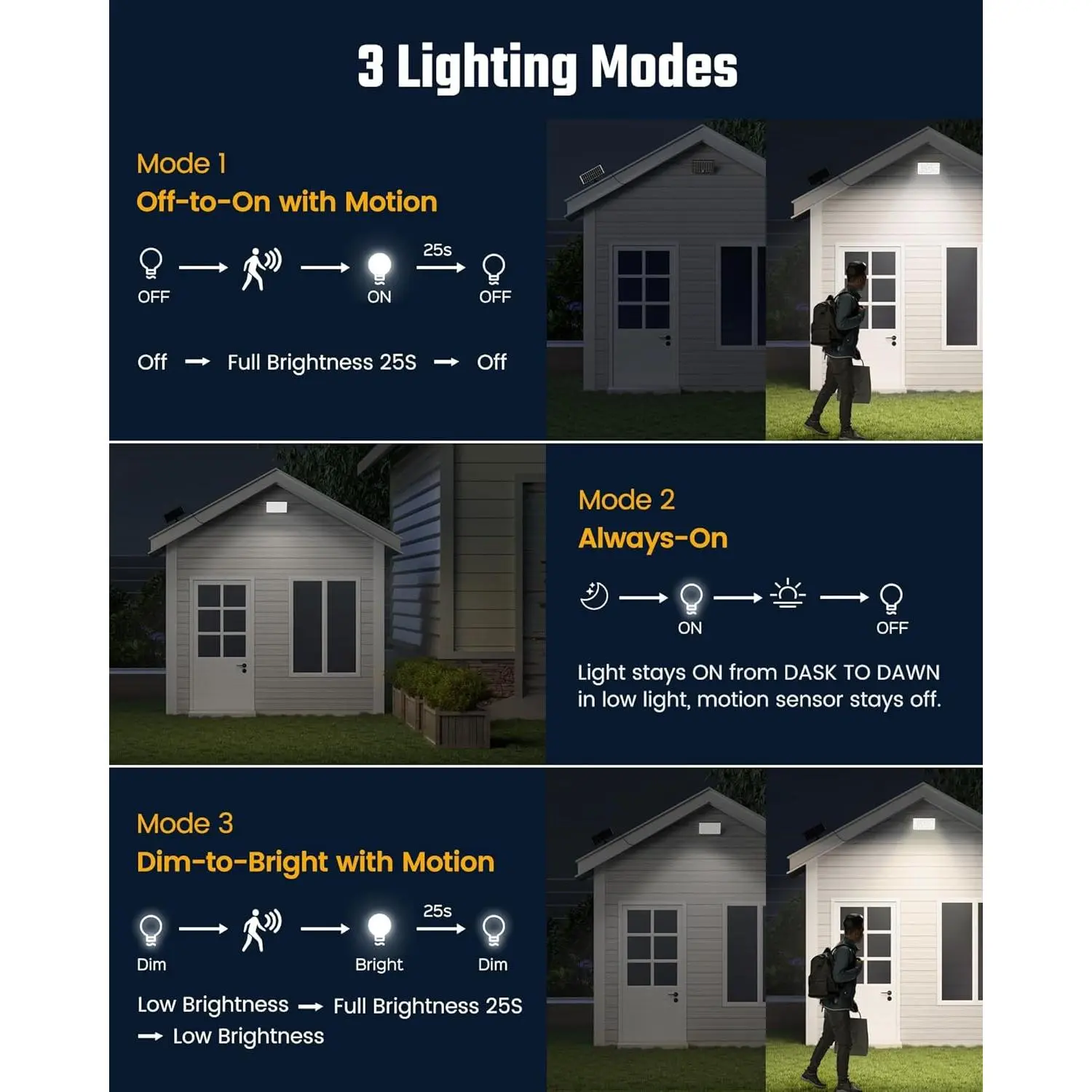 Mode 1: Light stays off, when sensing movement, it turns on bright light for 25s, then turns off.