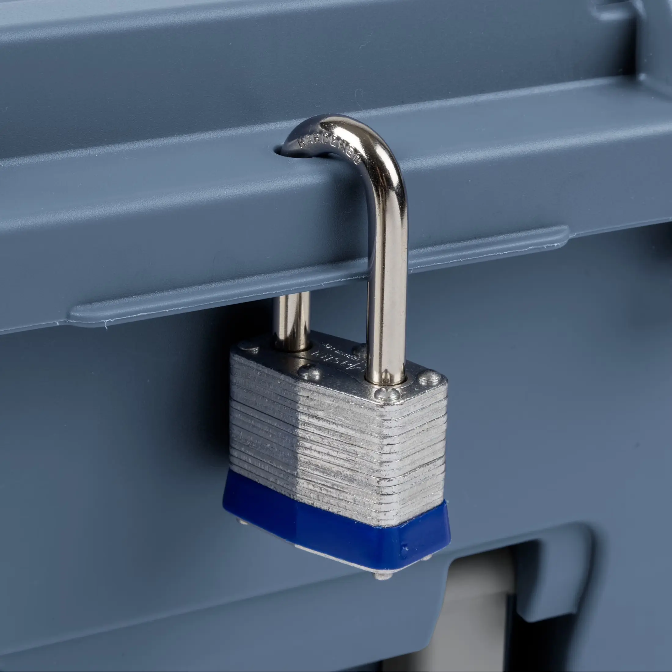 Built with a rugged plastic construction, this footlocker features a hinged lid with metal pins for smooth opening and long-lasting performance. The secure dual latches keep your items safely stored, while the lockable design allows you to add a standard padlock for extra protection.