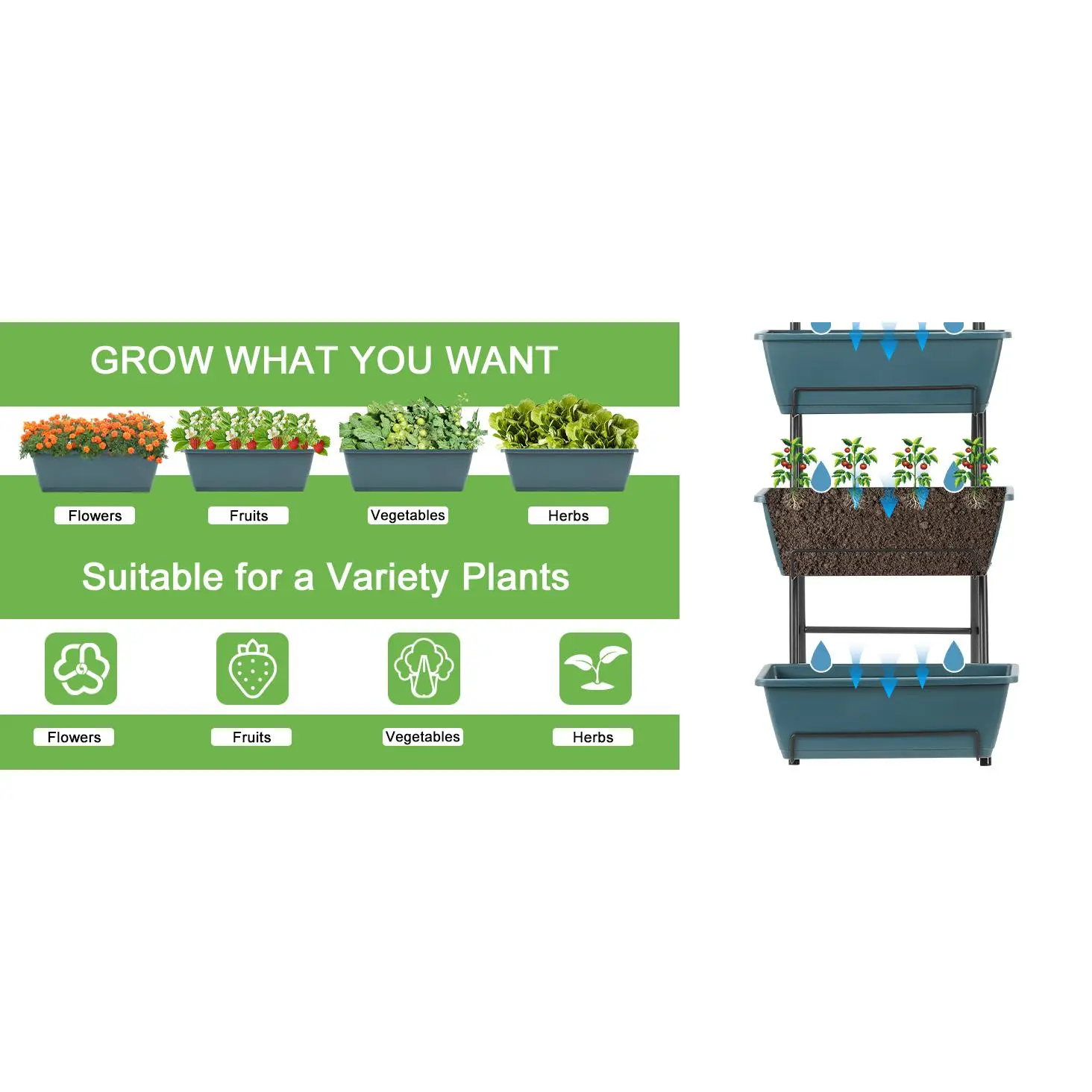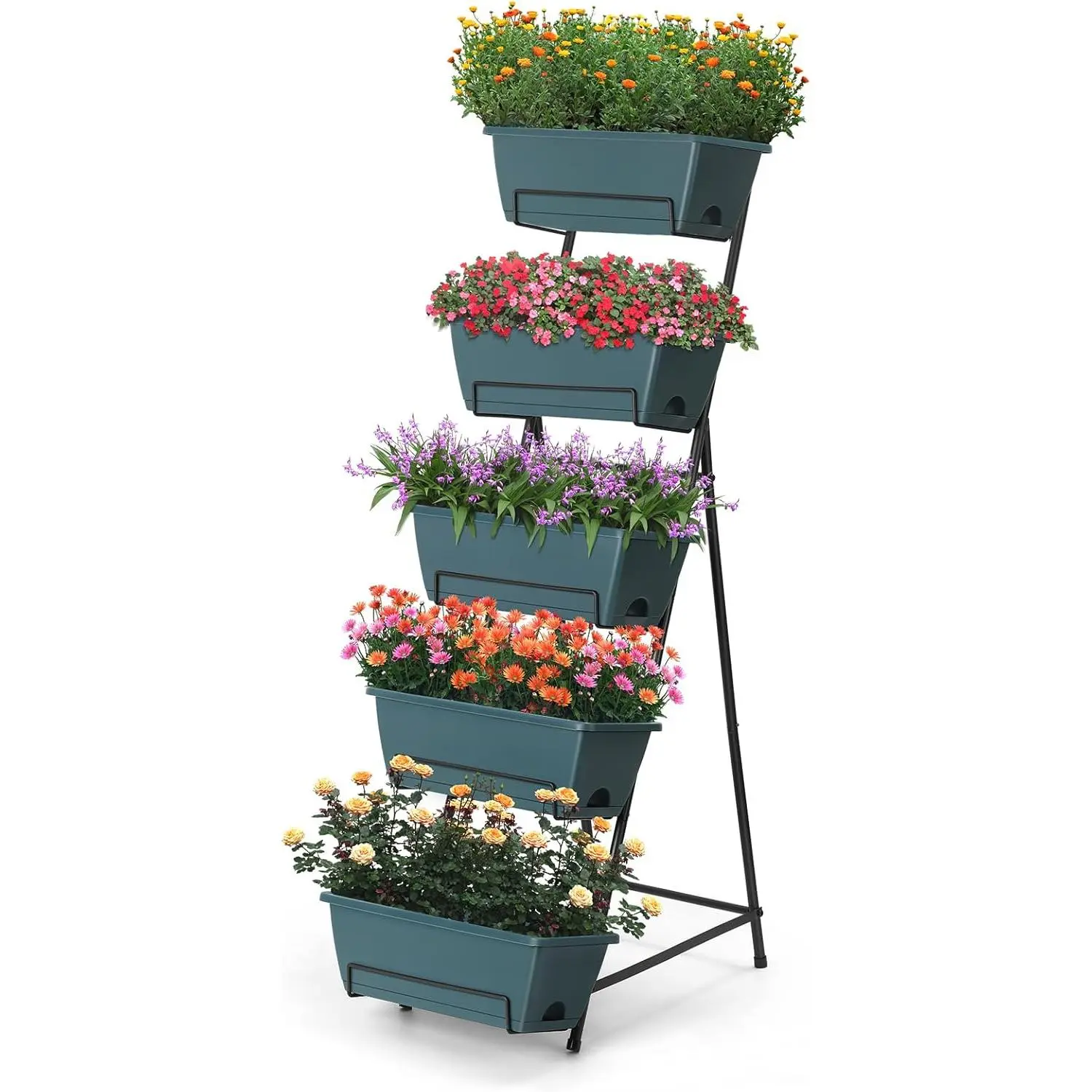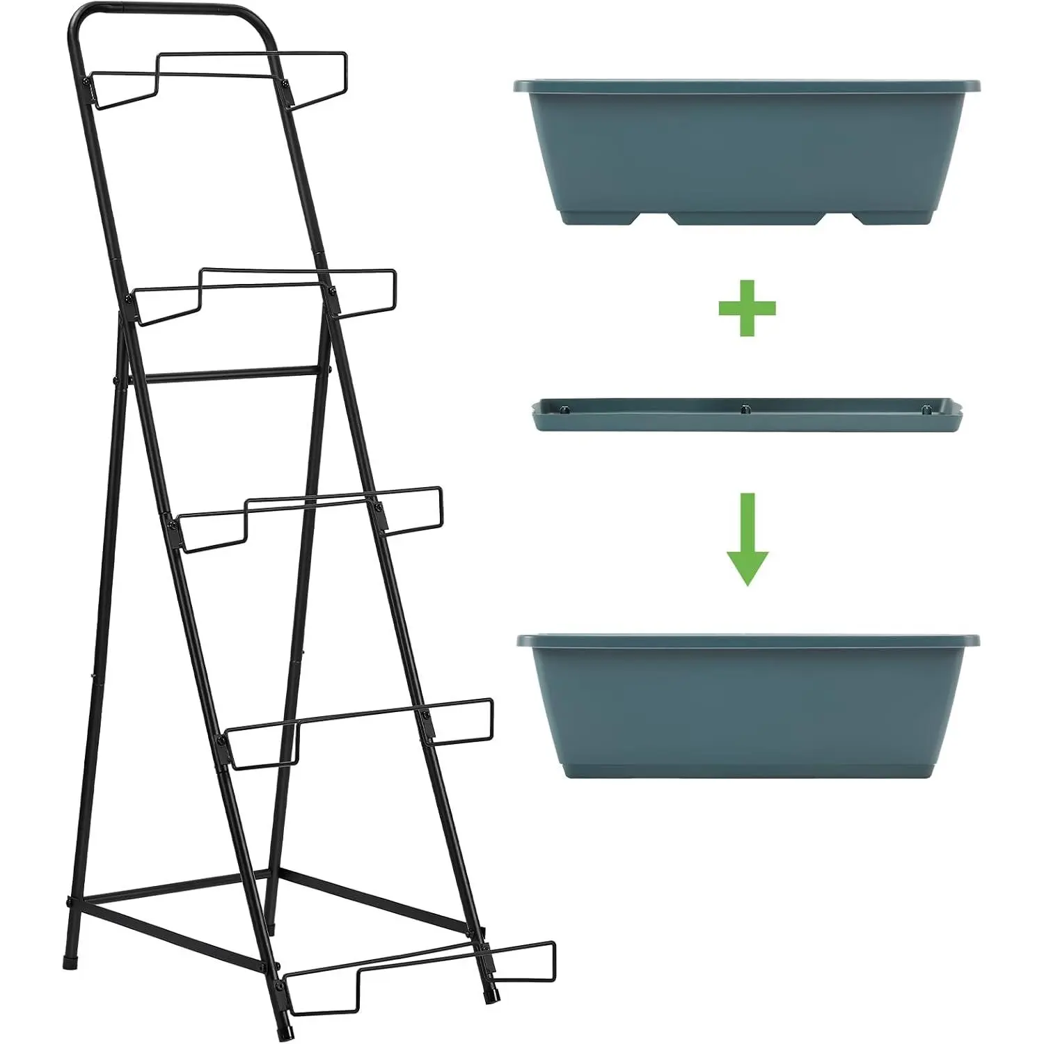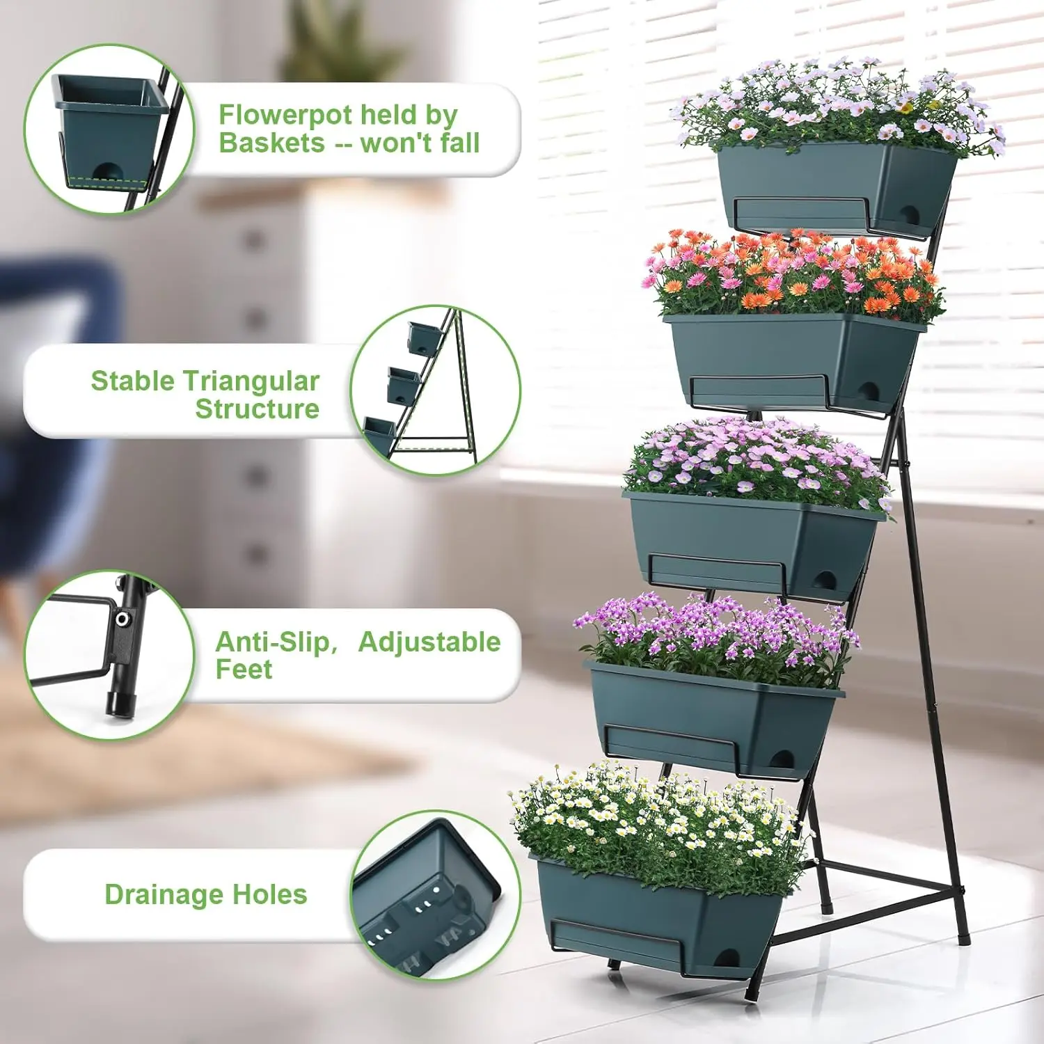 Sturdy and Durable-The vertical garden planter is made with a sturdy all-metal frame to ensure durability and longevity.The stable triangular design provides reliable support for your herbs, flowers, vegetables and moreLayered Design: The 5-layer vertical raised garden bed pots have an ergonomic trapezoidal design and appropriate height, which avoids continuous bending of planting work.All plants are placed in a staggered pattern with a stepped structure ensuring that all plants receive adequate sunlightExcellent Drainage System-Each plastic planter box is equipped with multiple drainage holes and a removable bottom tray to ensure effective drainage, maintain plant humidity balance, and prevent excess waterVERSATILE GARDENING SOLUTION-vertical garden planter grows a variety of plants, including herbs, flowers and vegetables, in any space.Suitable for patios, gardens, balconies, decks, living rooms and even greenhouses, providing you with a convenient gardening optionEasy to assemble-Overall Size: 48.2*18.5*13.2IN,Planter Box Size: 16.9*6.7*5.5 IN.Vertical garden planters outdoor equipped with instructions, it can be easily assembled in just a few steps.If you encounter any problems during assembly and use, please feel free to contact us