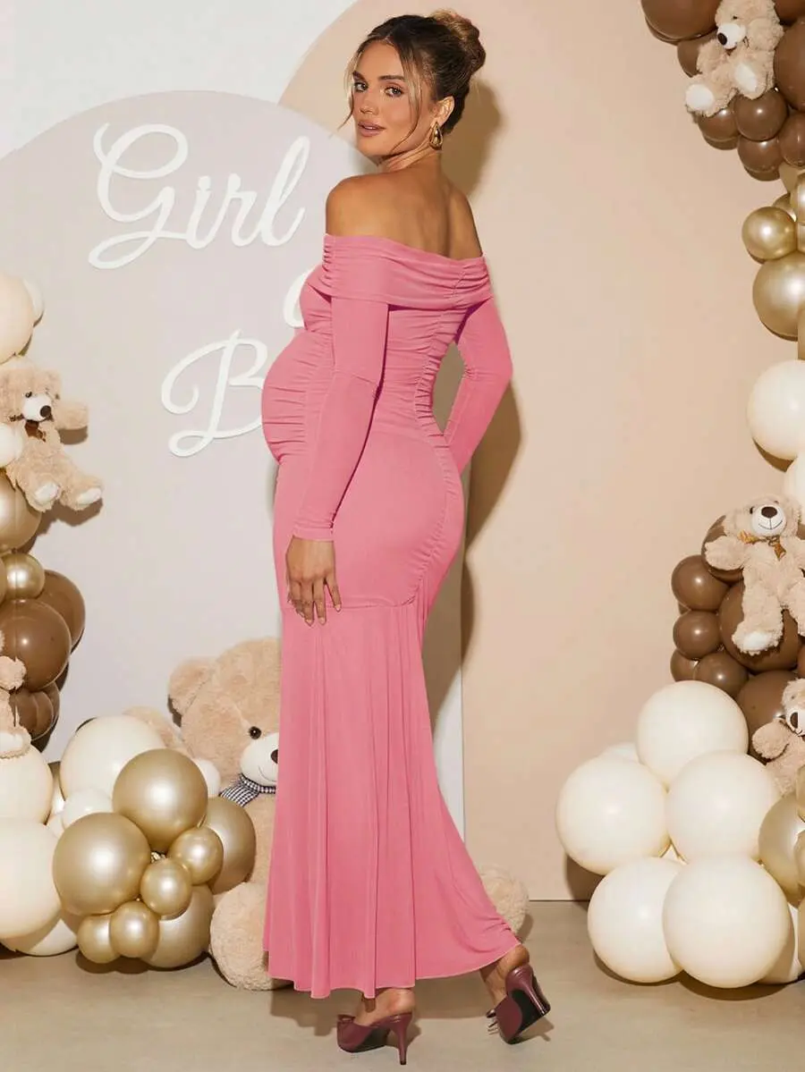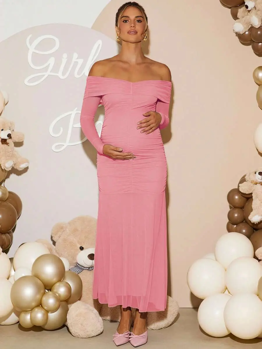 ADORIA Pink Off Shoulder Ruched Faux Pearl Maternal Party Gown Valentine Outfit Soft Feminine
