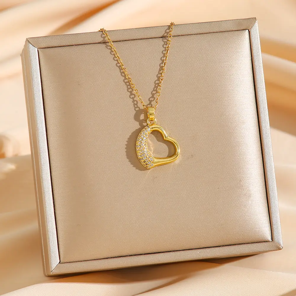 The hollow heart design is a masterclass in contemporary jewelry artistry: a smooth, polished frame forms the iconic love silhouette, while one half is adorned with a dense, sparkling array of brilliant-cut stones that catch the light with every movement, creating a mesmerizing, luminous glow. The contrast between the sleek, polished metal and the shimmering stone detail adds depth and dimension, making this necklace a statement piece that never feels overdone.