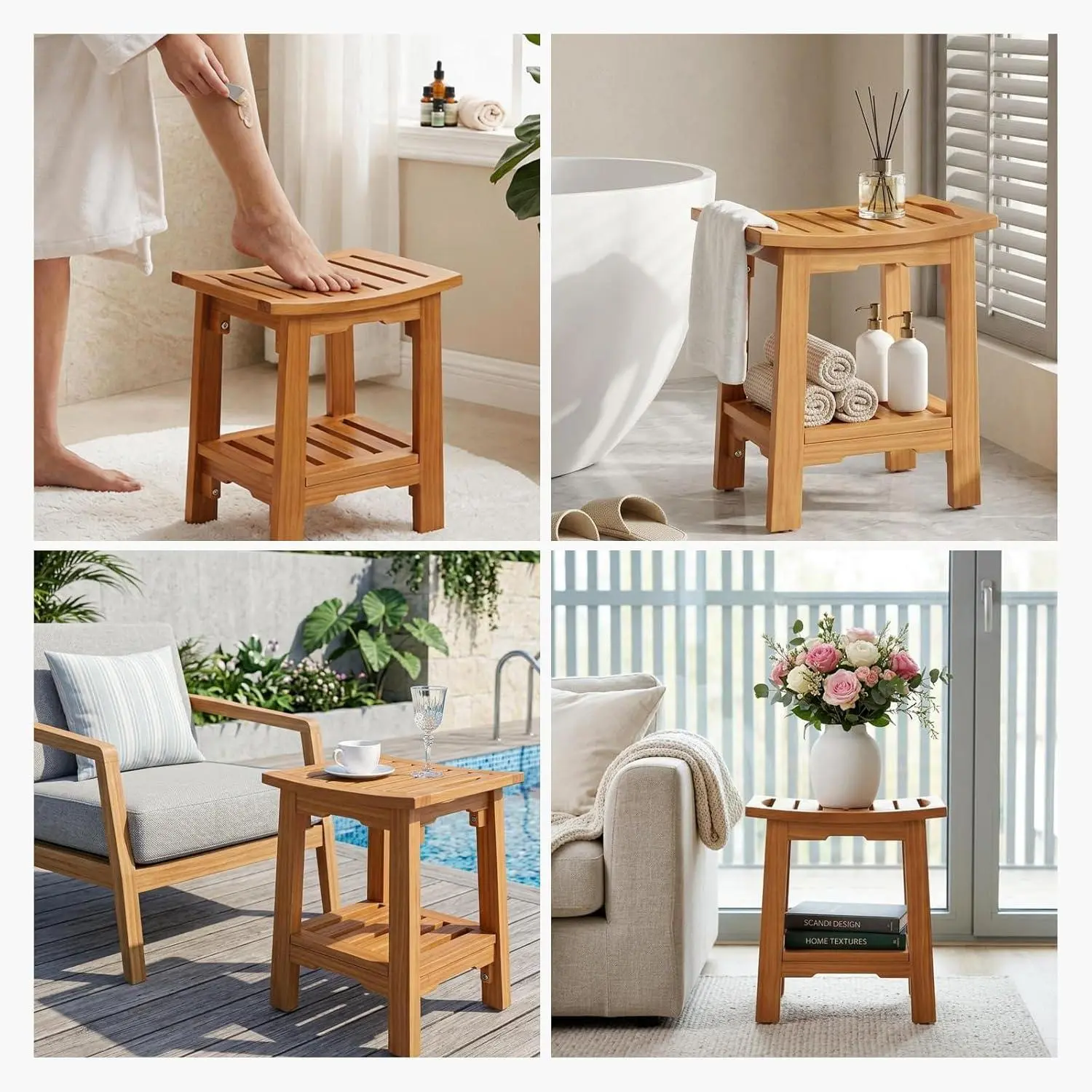 Crafted from premium pine with thickened legs, this stool supports up to 250 lbs. The reinforced frame ensures a wobble-free experience. Use it as a secure bathroom seat or a display stand for towels and plants. The multi-layer NC paint finish makes it waterproof and stain-resistant, maintaining a beautiful natural wood tone.