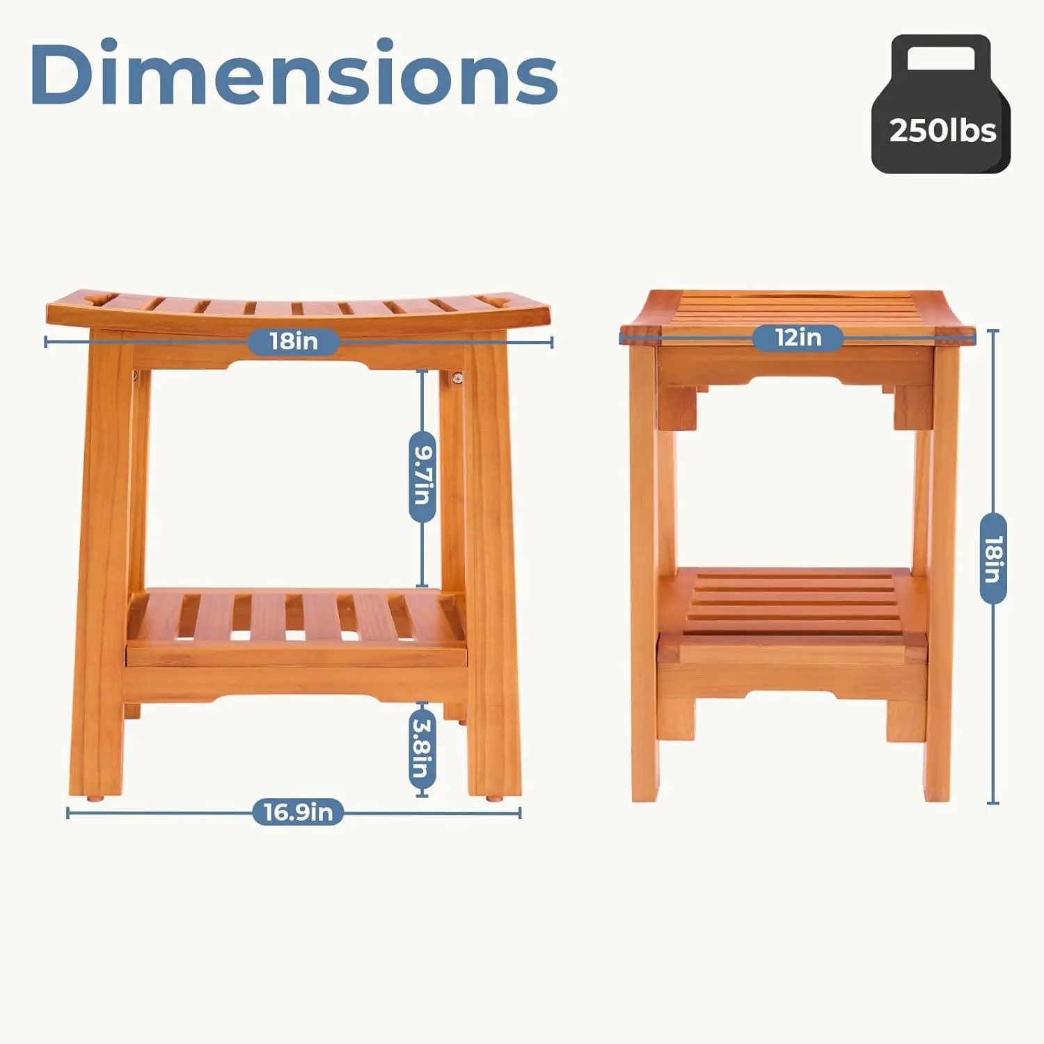 Enhance your bathroom with this premium wooden shower bench. Crafted from pine with a multi-layer NC paint finish, it features a curved seat, side handles, and a convenient shelf. Choose 14" or 18" widths to fit your space. This non-slip stool supports up to 250 lbs, ensuring stability and safety for seniors and adults. Use it as a secure seat or a stylish display stand.