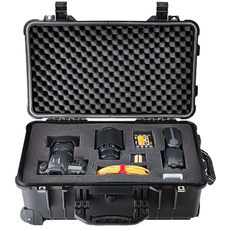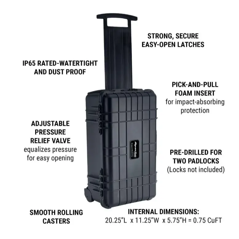 This rugged APACHE carry-on case is designed to fit most airline size requirements. Protect cameras, microphones, handguns, and other specialized equipment with this exceptionally rugged weatherproof hard case. Constructed from extremely durable polypropylene, this professional-quality case takes a beating while protecting the contents from impact, moisture, and microscopic dust. The built-in purge valve equalizes pressure so you can open the case after changing elevations.