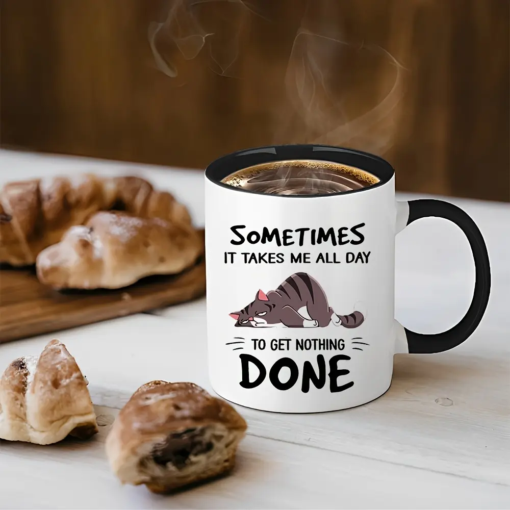 Coffee Mug With Funny Quote "Sometimes It Takes Me All Day To Get Nothing Done" - Insulated Reusable Mug For Hot & Cold Drinks, Cute Cat Design, Hand Wash Only, Ideal Gift For Home, Office, Family & Friends