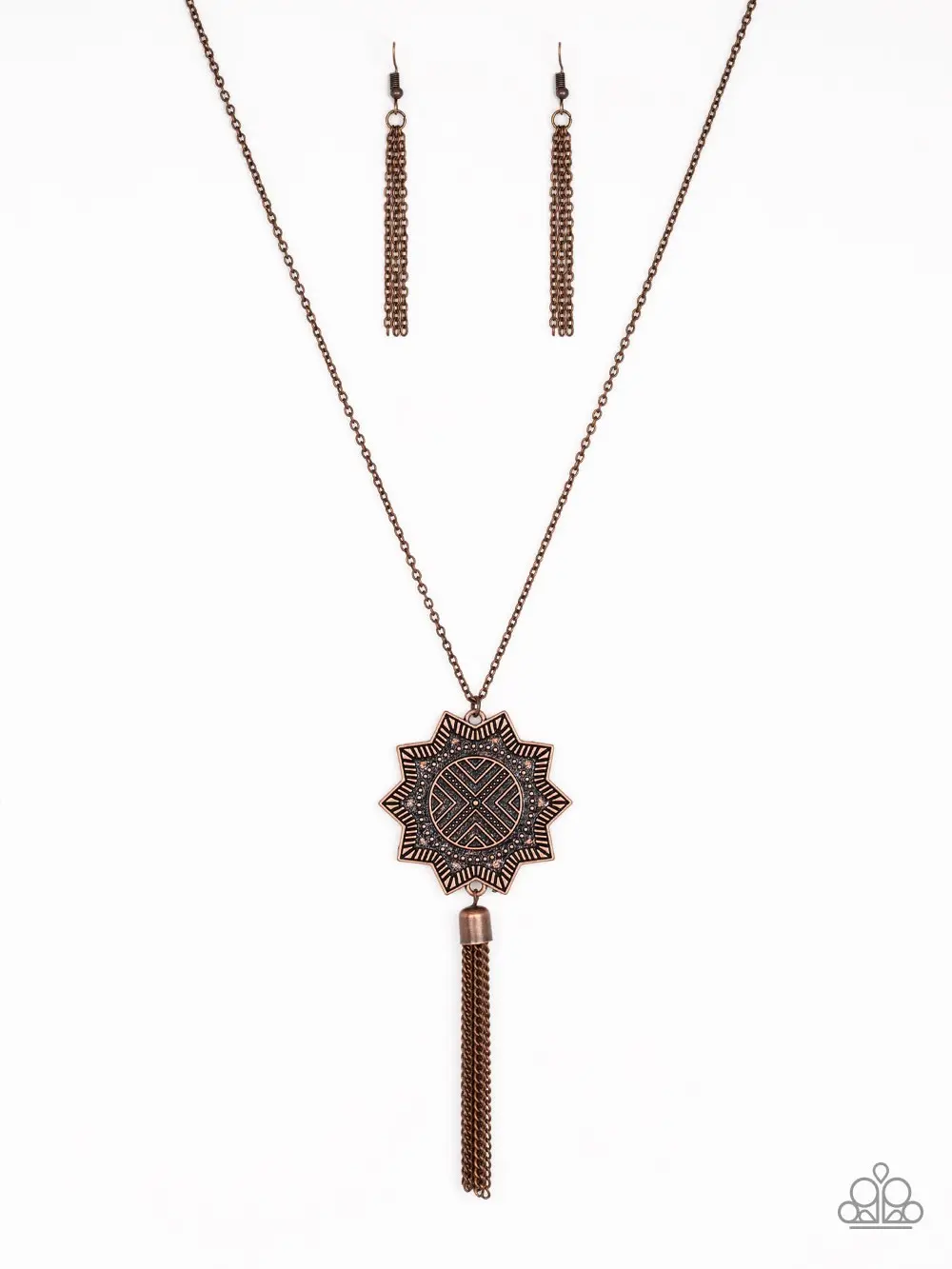 A textured sunburst pendant swings from the bottom of a lengthened copper chain. A shimmery copper chain tassel swings from the bottom of the tribal inspired pendant for a seasonal finish. Features an adjustable clasp closure. Sold as one individual necklace. Includes one pair of matching earrings. Weight: 0.85