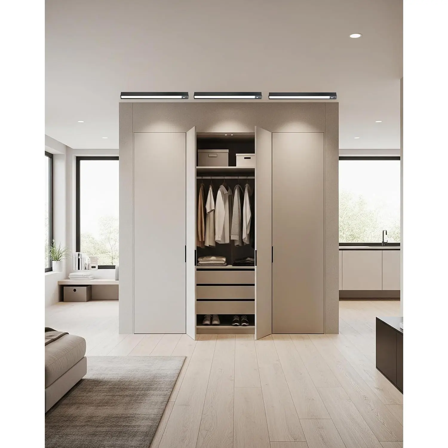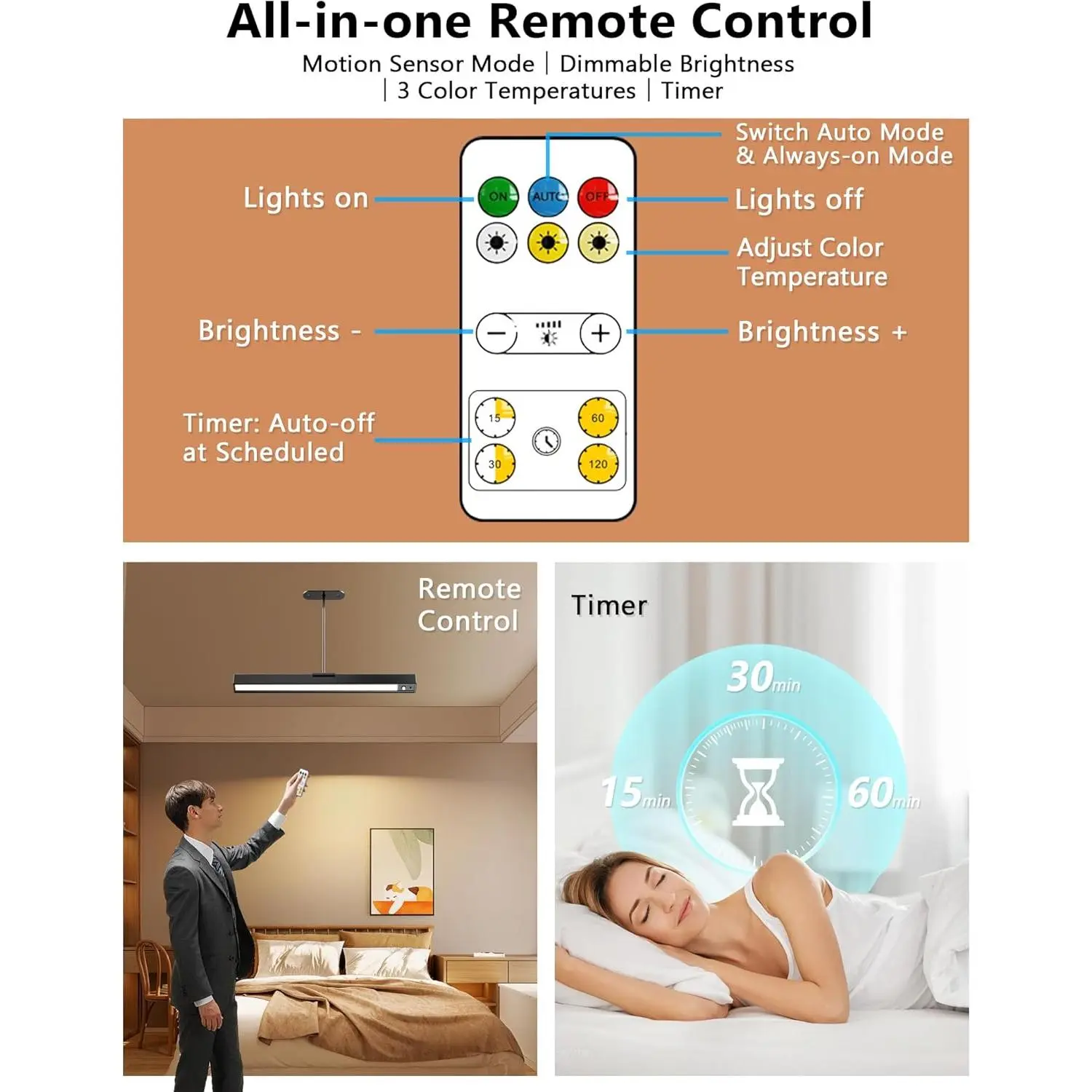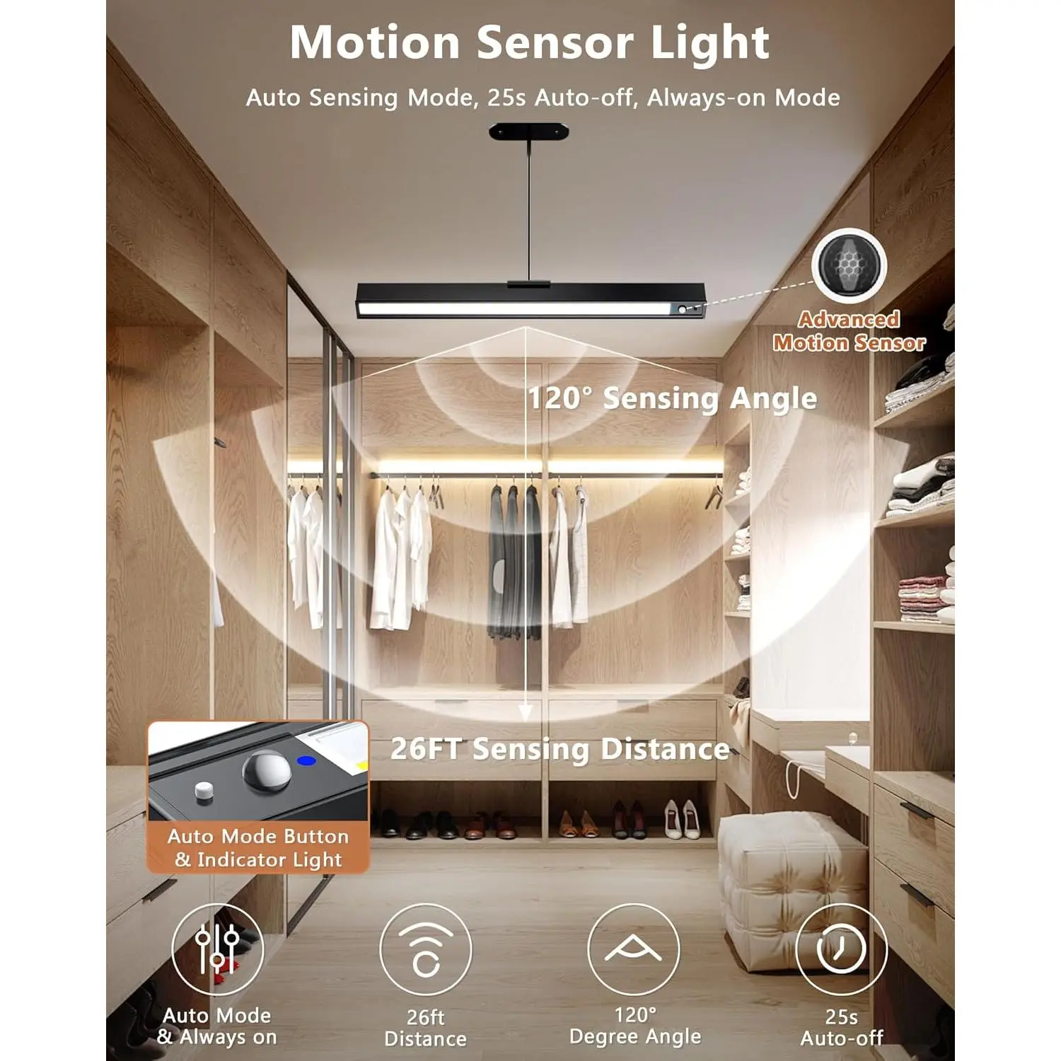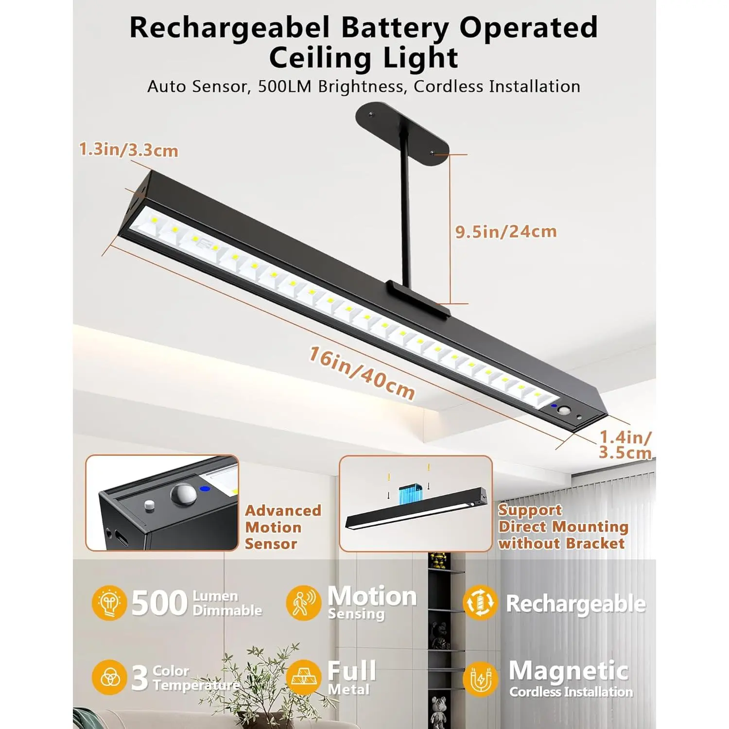 [Battery Operated Motion Sensor Light] Featuring a built-in advanced motion detector with a 120° detection angle, this motion sensor light indoor detects movement from 5-8 meters (16-26ft) away, automatically turning on when motion is detected.Choose between auto-sensing mode (turns off after 25 seconds of no motion) or always-on mode, making it perfect for use as closet lighting, shower lights, or bathroom illumination.[500LM Brightness & Dimmable Lighting] With 16in/40cm long light bar and 44 pcs bright & long life-span SMD LED beads, enjoy 500LM brightness that illuminates a wider area than 300sqft.Stepless dimmable brightness and switch between 3 color temperatures (warm 3000K, natural 4500k, cool 6000k) for the perfect setting in Closet Lights Motion Sensored, shower lights, Pantry, Hallway, Stairs, Garage, or any room needing battery powered ceiling light.[Rechargeable Battery Lights] The built-in 7000mAh rechargeable battery ensures extended use.Versatile brightness settings offer up to 30hrs in medium, 15hrs in maximum, and an impressive 60hrs in minimum continuous brightness.The cordless lamp is magnetically attached to the mounting base, making it effortlessly detachable for easy recharging by a USB-C charging port.In motion sensing mode, if triggered 15 times daily for 25 seconds illumination, the built-in battery supports an impressive 200 days of continuous use, making it perfect for night light and various indoor spaces.[Remote Control & Physical Touch Buttons]Use the battery-operated light with the included remote or the integrated physical touch buttons to control on/off, brightness, and color adjustments.In constant-on mode, the remote allows you to set a timer for automatic shutdown after 15, 30, 60, or 120 minutes.Additionally, the light features a dedicated physical button to activate motion sensing mode, with a blue indicator light that stays on when the mode is enabled.Perfect for cordless motion sensor closet lights, offering easy control from anywhere.[Cordless Magnetic & Bracket Installation] This battery-powered ceiling light offers two cordless installation methods.Magnetically attach it directly to a surface for quick setup in closets, bathrooms, under-counter light fixtures or hallways, or use the included 24cm (9.5in) bracket to mount it on the ceiling for a stylish pendant light effect.Easily detach the light bar for recharging or use it as a portable LED lamp.The cordless lamp is magnetically attached to the mounting base, making it effortlessly detachable for easy recharging.[Stylish & Durable Design] Featuring a sleek black metal body and a long-bar shape, this battery-powered LED light is both modern and versatile.Its minimalistic design adds style and makes it ideal for narrow spaces where square or round lights may not fit as seamlessly.Use the included 24cm (9.5in) pendant bracket to create a stylish ceiling-mounted pendant light effect.Perfect for cordless closet and ceiling lighting, under-counter fixtures, shower lamps, or any space needing a practical and stylish lighting solution.