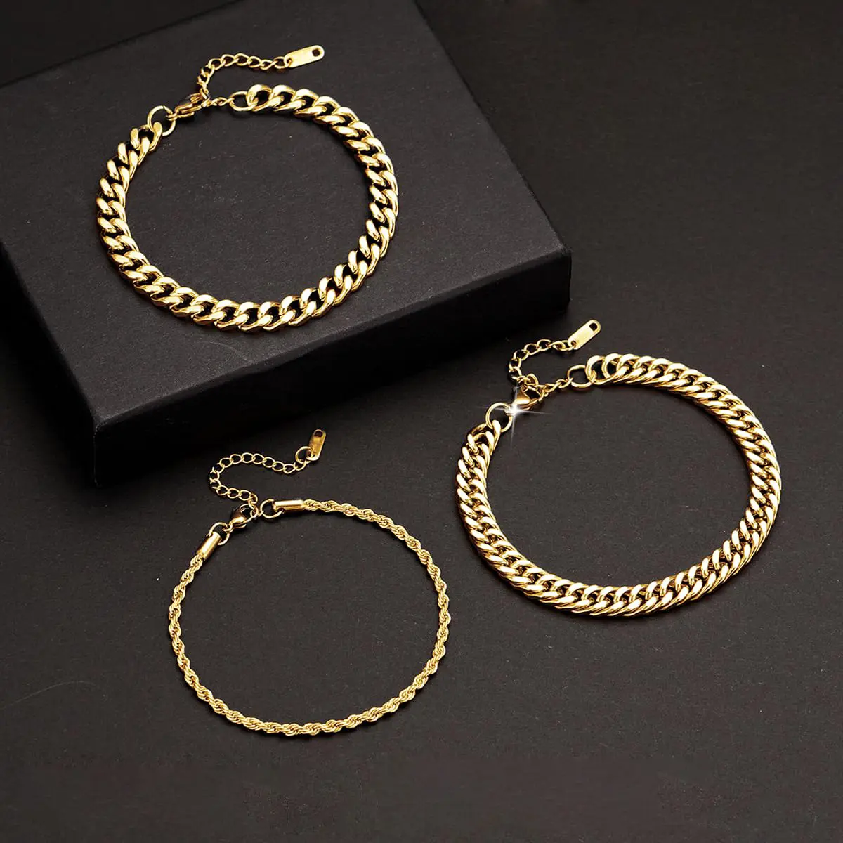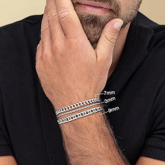 Upgrade your accessory game with this set of 3 stainless steel bracelets. Perfect for men, these Cuban link bracelets come in gold and silver finishes. Each bracelet measures 7.8 inches, ensuring a comfortable fit. Ideal for everyday wear, these bracelets add a touch of elegance to any outfit.