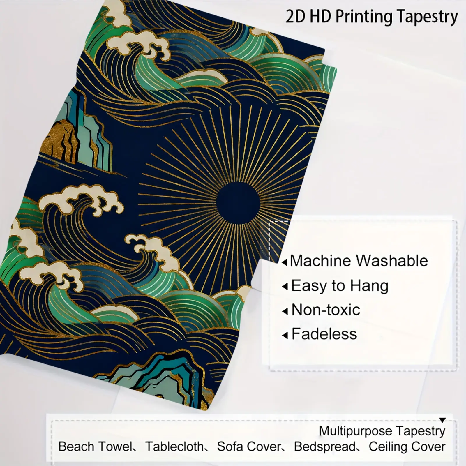 5. 1 Piece Japanese Wave Sun Tapestry, Navy Blue Gold Foil Great Wave HD Digital Print Wall Hanging, Boho Polyester Tapestry, Lightweight Fade-Resistant, Easy to Hang for Bedroom, Living Room & Dorm