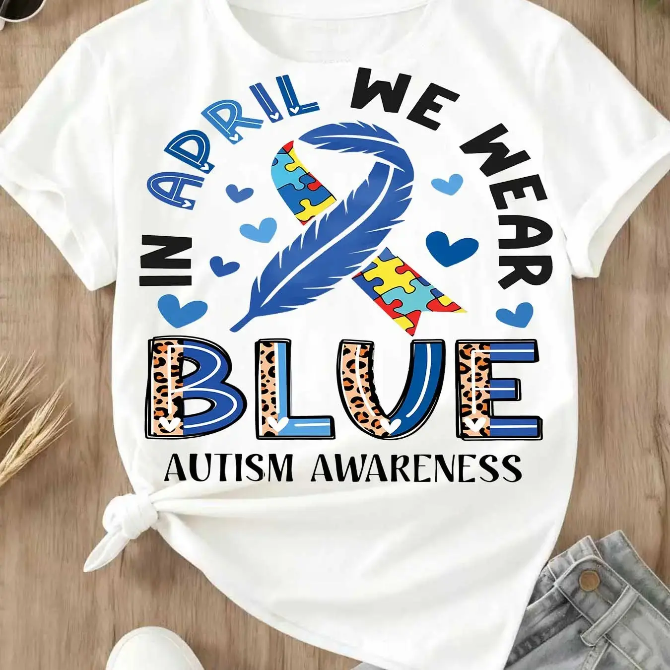 In April We Wear Blue Shirt, Autism Awareness Ribbon Tee, Puzzle Piece Graphic Shirt, Women Autism Awareness Month T Shirt