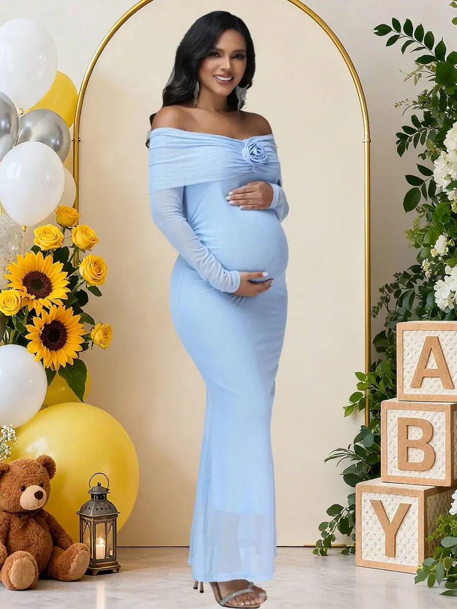 ALLITA Maternity Mesh Off-Shoulder Dress For Baby Shower, Cloak Maxi Women Outfit